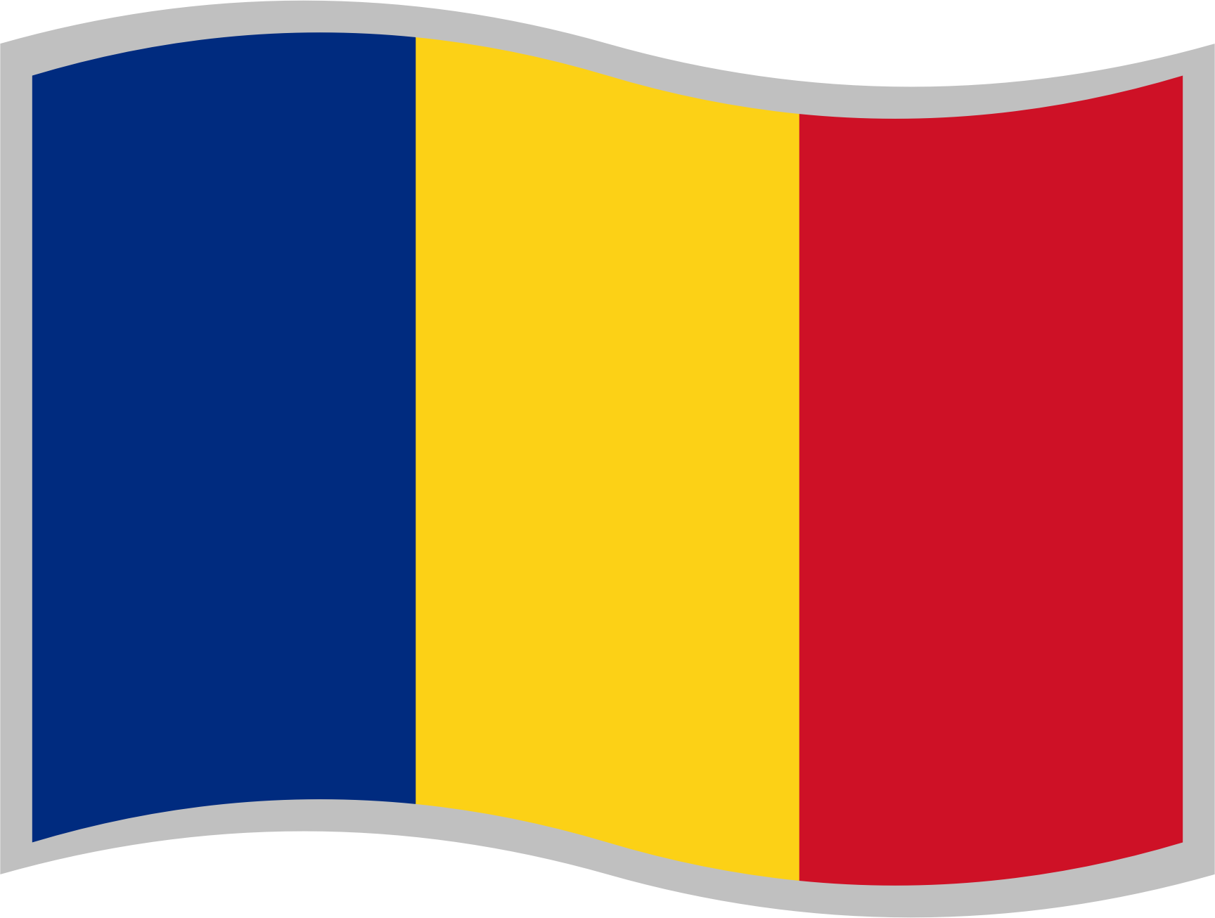 Flag of Romania; slightly curved to suggest waving in the wind; with a grey border for use on a background similar to one of the flag's colours; can represent Romania or the Romanian language.