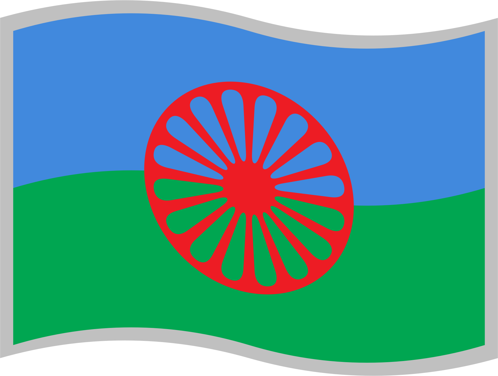 Flag of the Romani people; slightly curved to suggest waving in the wind; with a grey border for use on a background similar to one of the flag's colours.