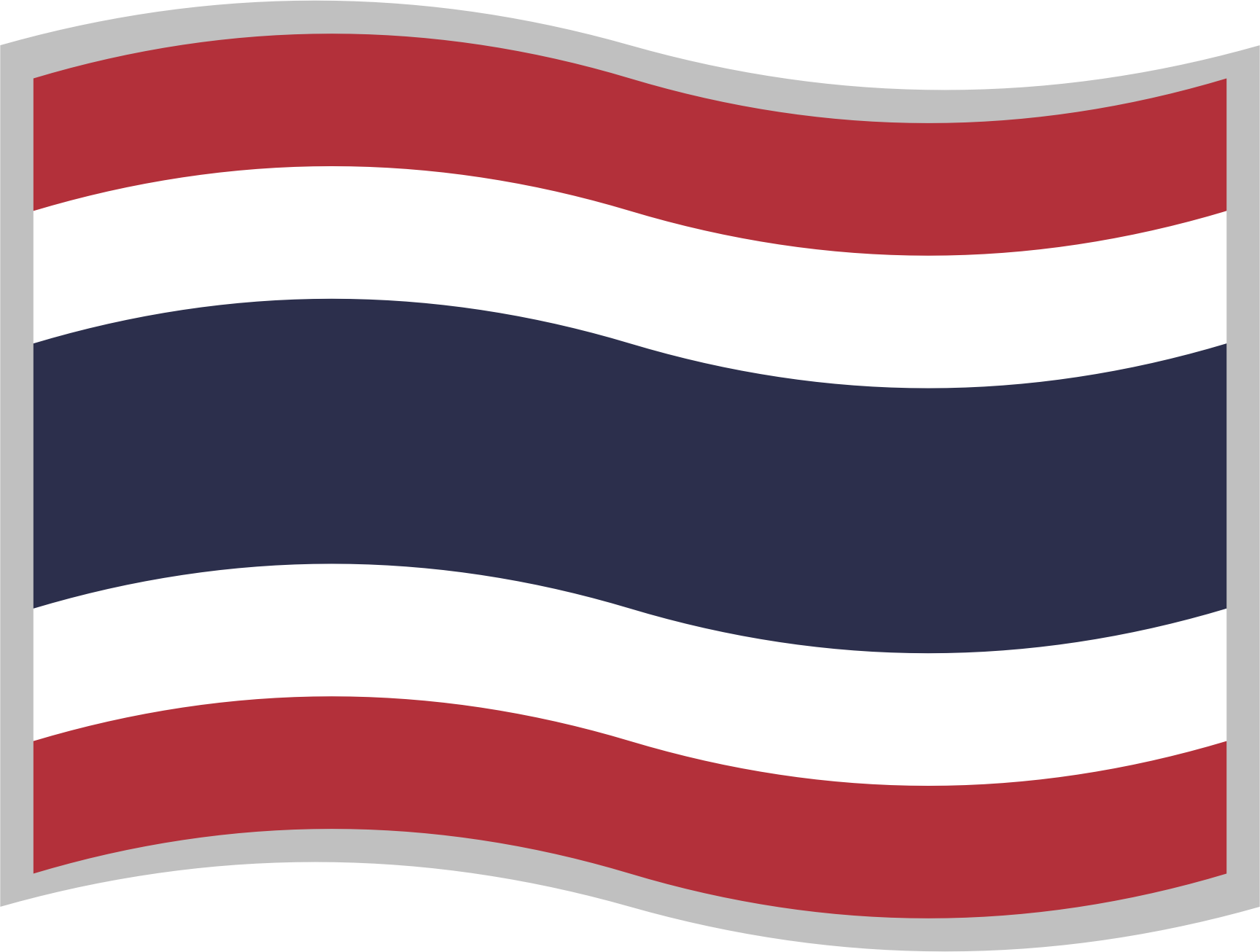 Flag of the Kingdom of Thailand; slightly curved to suggest waving in the wind; with a grey border for use on a background similar to one of the flag's colours; can represent the Kingdom of Thailand or the Thai language.