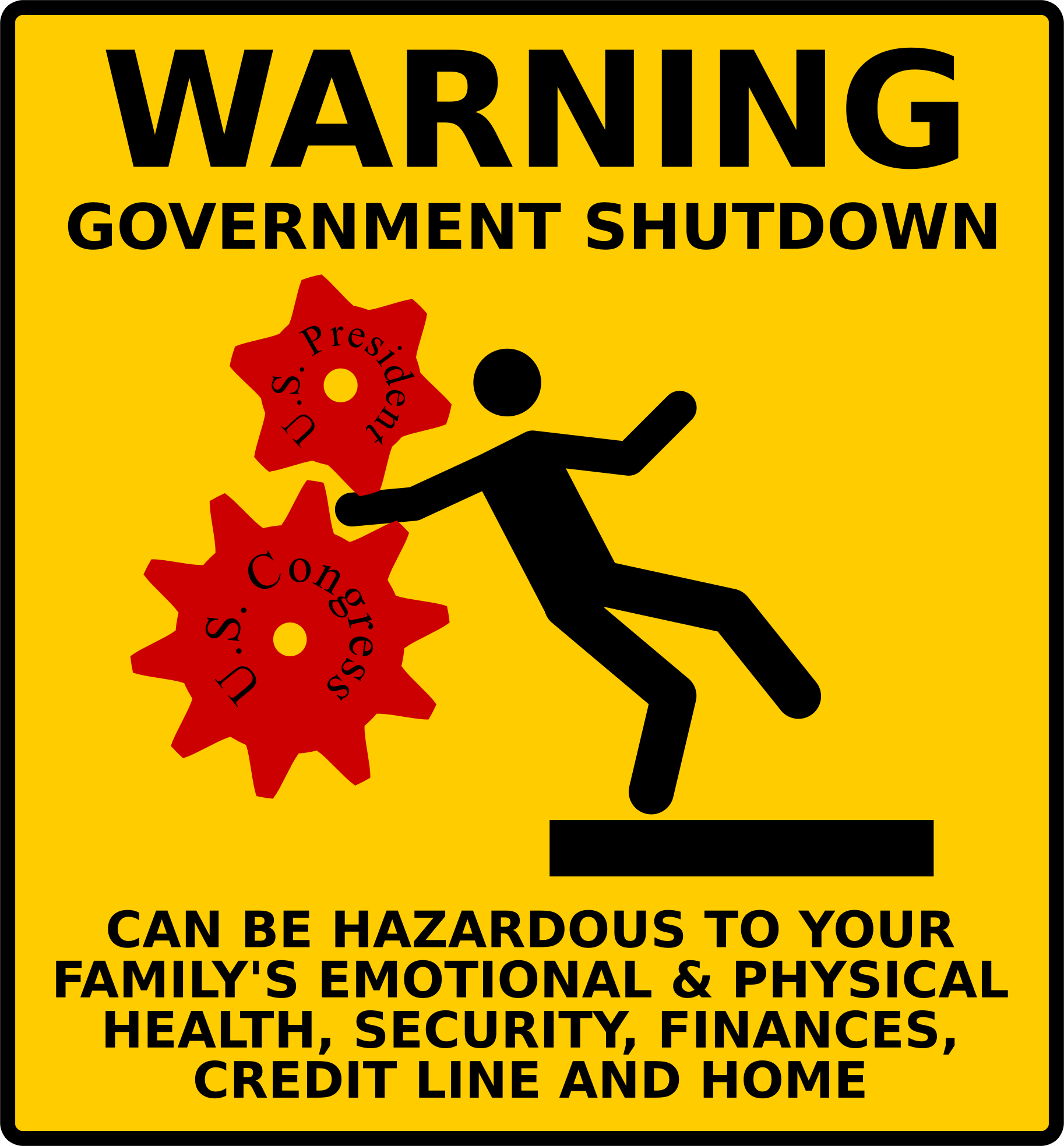- remix+313981 warning caution dangerous danger sign hazardous gears cogs people family parody joke humor political cartoon political goverment life shutdown president congress