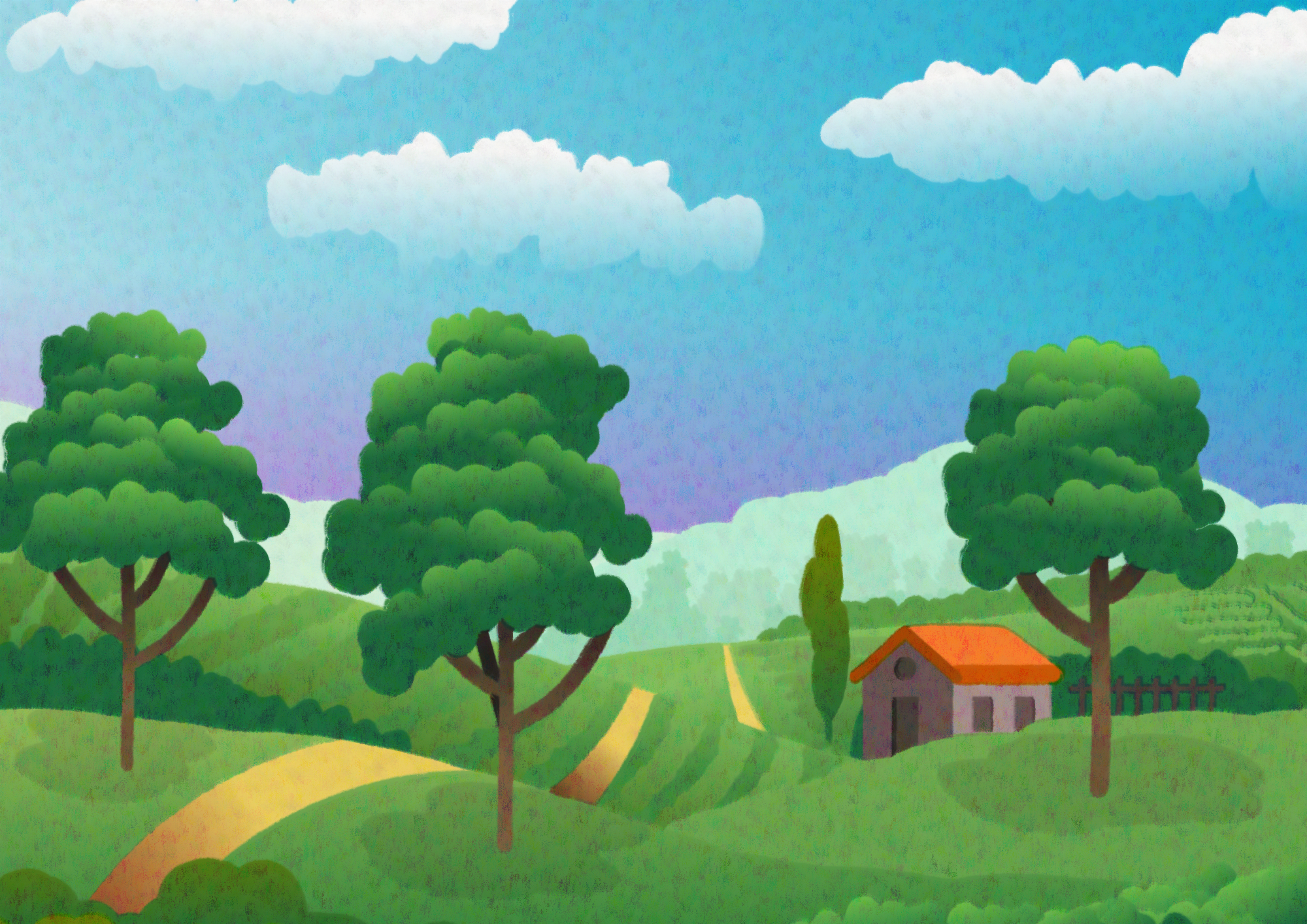 A landscape drawing scaled to fitthe width of a 4k screen and with additional filters for a paper texture overlay and a displaced style distinct for a drybrush or oil pastel painting.