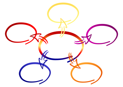 One large multi-color center ellipse points to several other single-colored ellipses via arrows to symbolize that there is one source disseminating content/information to sevaral other sources. It could could e.g. also be interpreted as one central instance giving orders to several sub-instances. This drawing is a re-interpretation of a similar drawing I found on the web but could not get as svg.