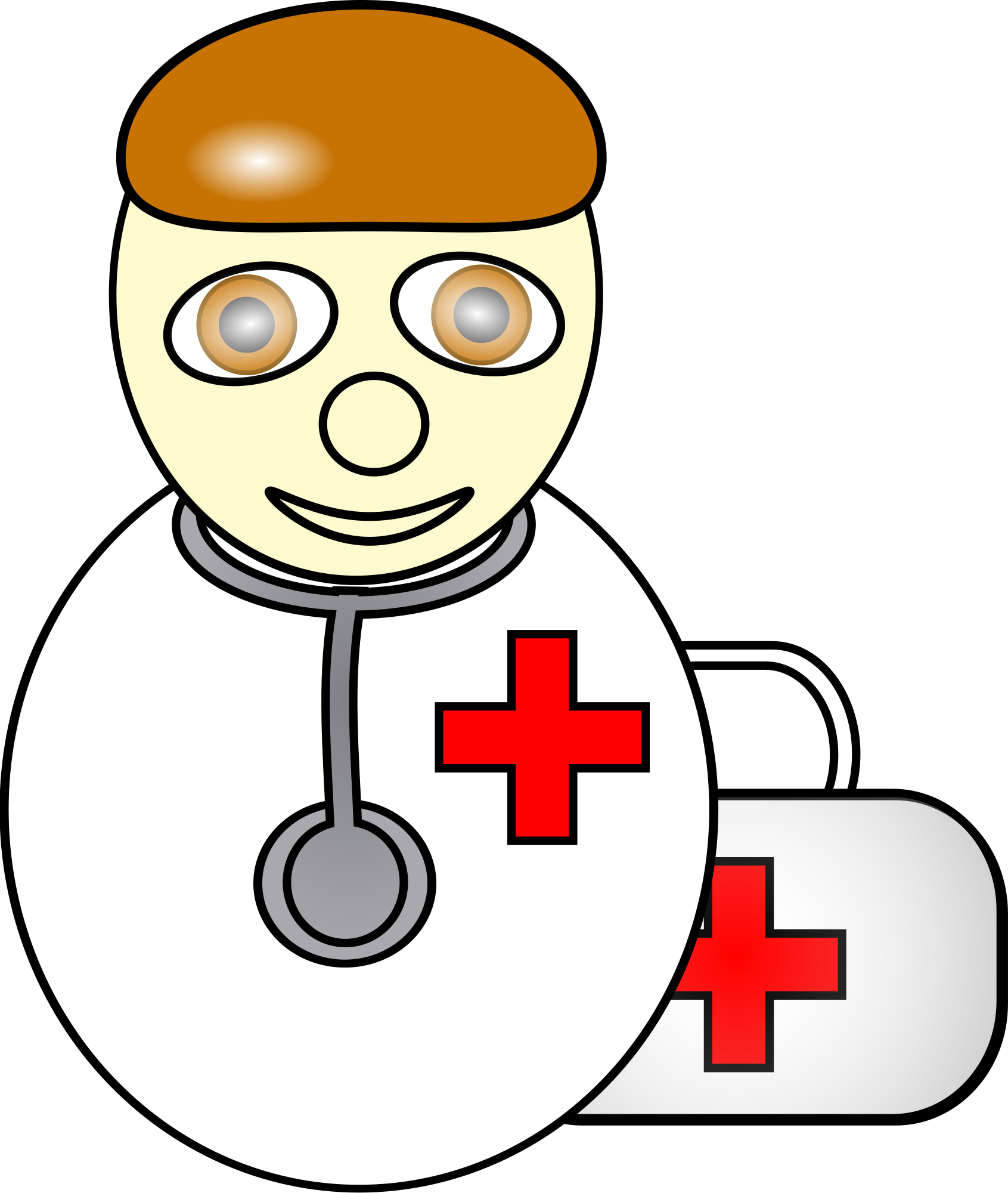 cartoon doctor in white coat with red cross emblem and medical kit.