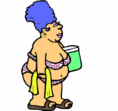 A cartoon of a lady going to the beach with a chilly bin and towel