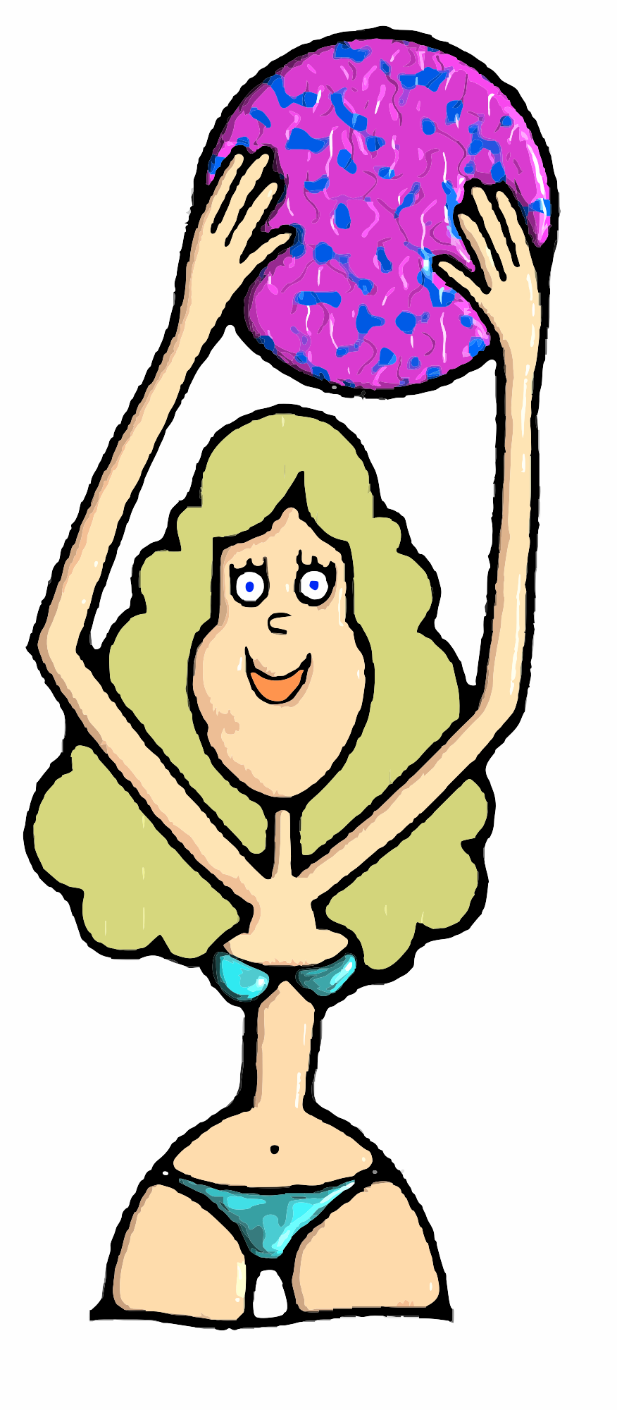 A cartoon of a slim girl playing with a ball in a bikini