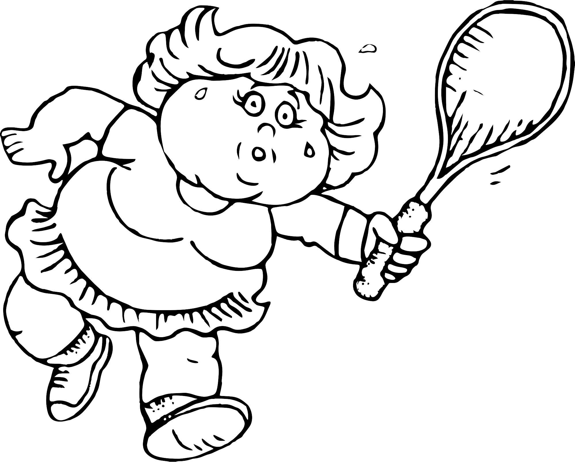 A black and white cartoon of an over weight lady playing squash