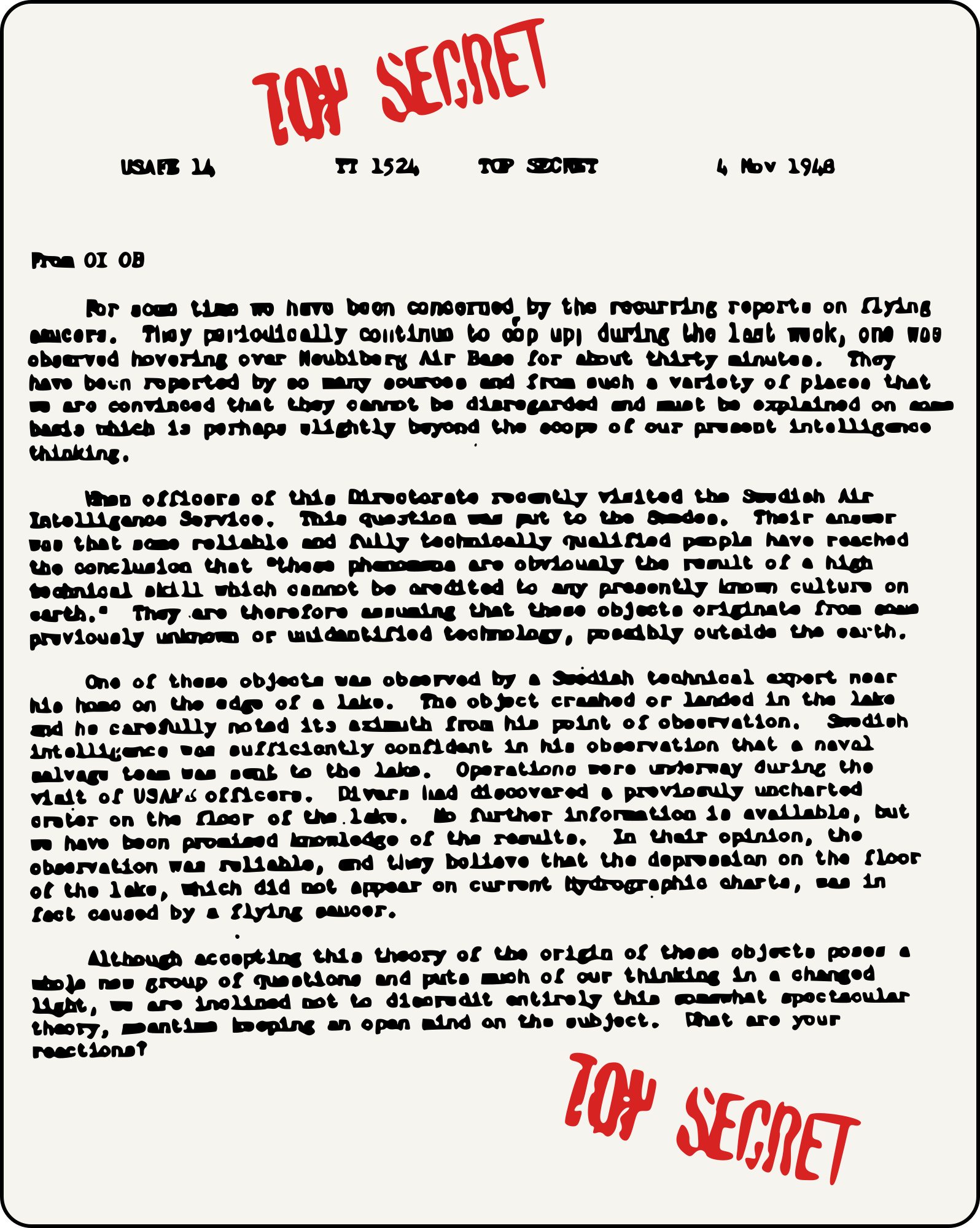 this is based on a REAL 1948 US Airforce document talking about reports of a possible "Extraterrestrial" craft discovered in Sweden. Officially nothing was ever really found... but its fun to imagine this is proof of aliens being found and hidden!