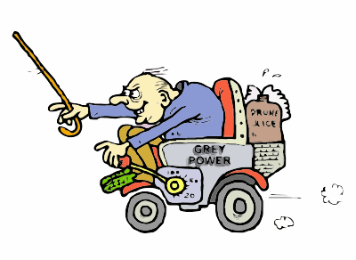 An Old man riding his scooter fast powered by prune juice
