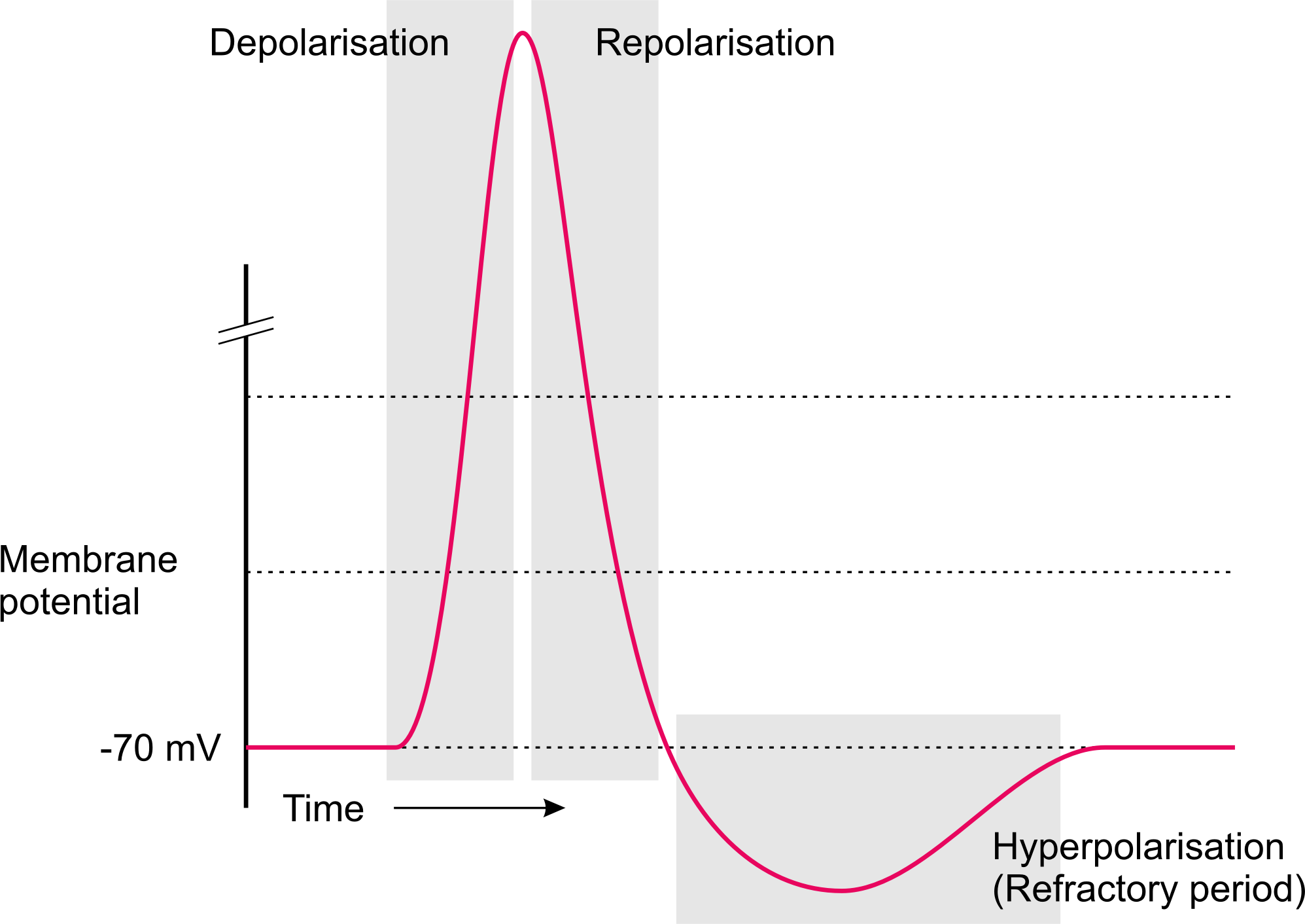 Schematic of an action potential including depolarization, repolarization, and hyperpolarization phases.