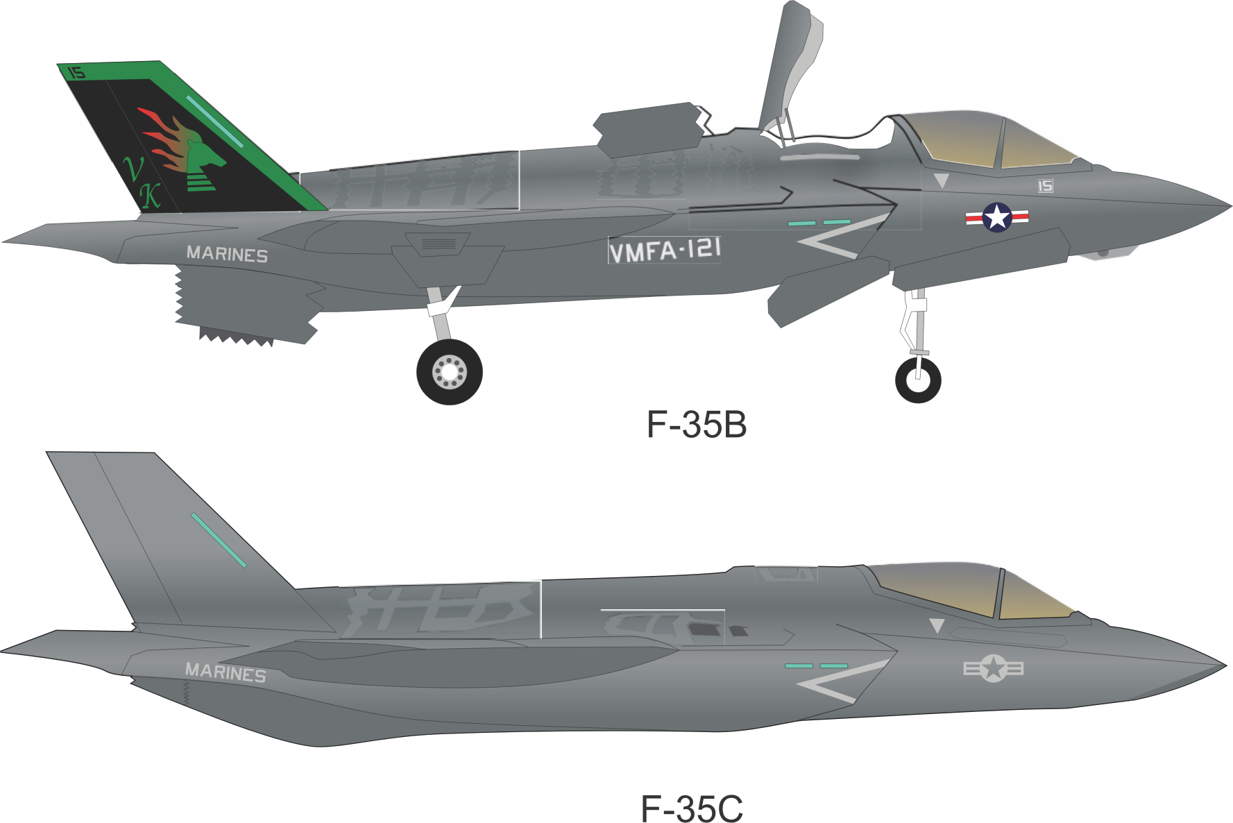 U.S. Marine Corps F-35 Lightning II Joint Strike Fighter aircraft. The F-35B is assigned to Marine Fighter Attack Squadron One Twenty One (VMFA-121) "Green Knights" based at Marine Corps Air Station Iwakuni (岩国飛行場), Yamaguchi Prefecture, Japan, and is the the short take-off and vertical-landing (STOVL) variant. The F-35C is the carrier-based variant and has no unit markings. The images were extracted from an official U.S. Navy publication and therefore are in the public domain.