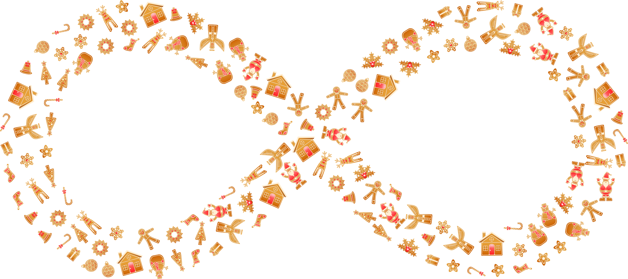 - remix+208592 Gingerbread Infinite Infinity Forever Looping Repeating Endless Eternity Eternal Unlimited Icons Christmas Holiday Decorative Decoration Ornamental Christmas Tree Christmas Wreath Gift Present Gingerbread House Holly Reindeer Santa Claus Snowflake Snowman Star Stocking Angel Bauble Bell Candy Cane