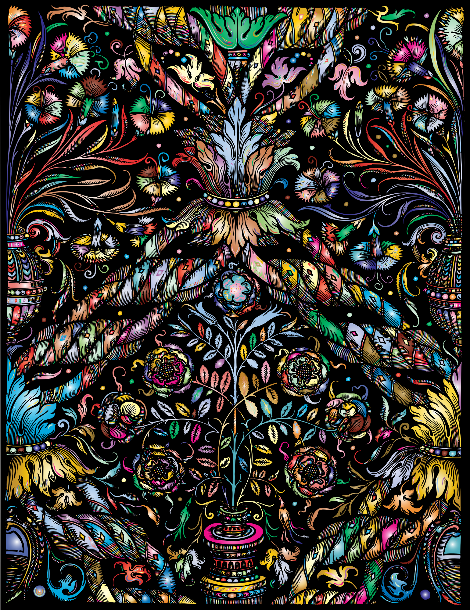 - Flowers Flourish Floral Line Art Decor Decorative Decoration Ornamental Vintage Retro Old Antique Colorful Prismatic Chromatic Rainbow
