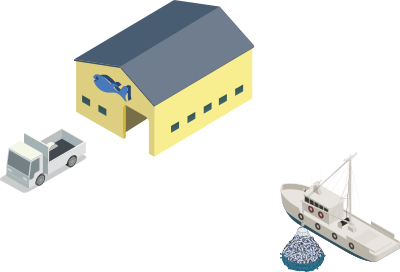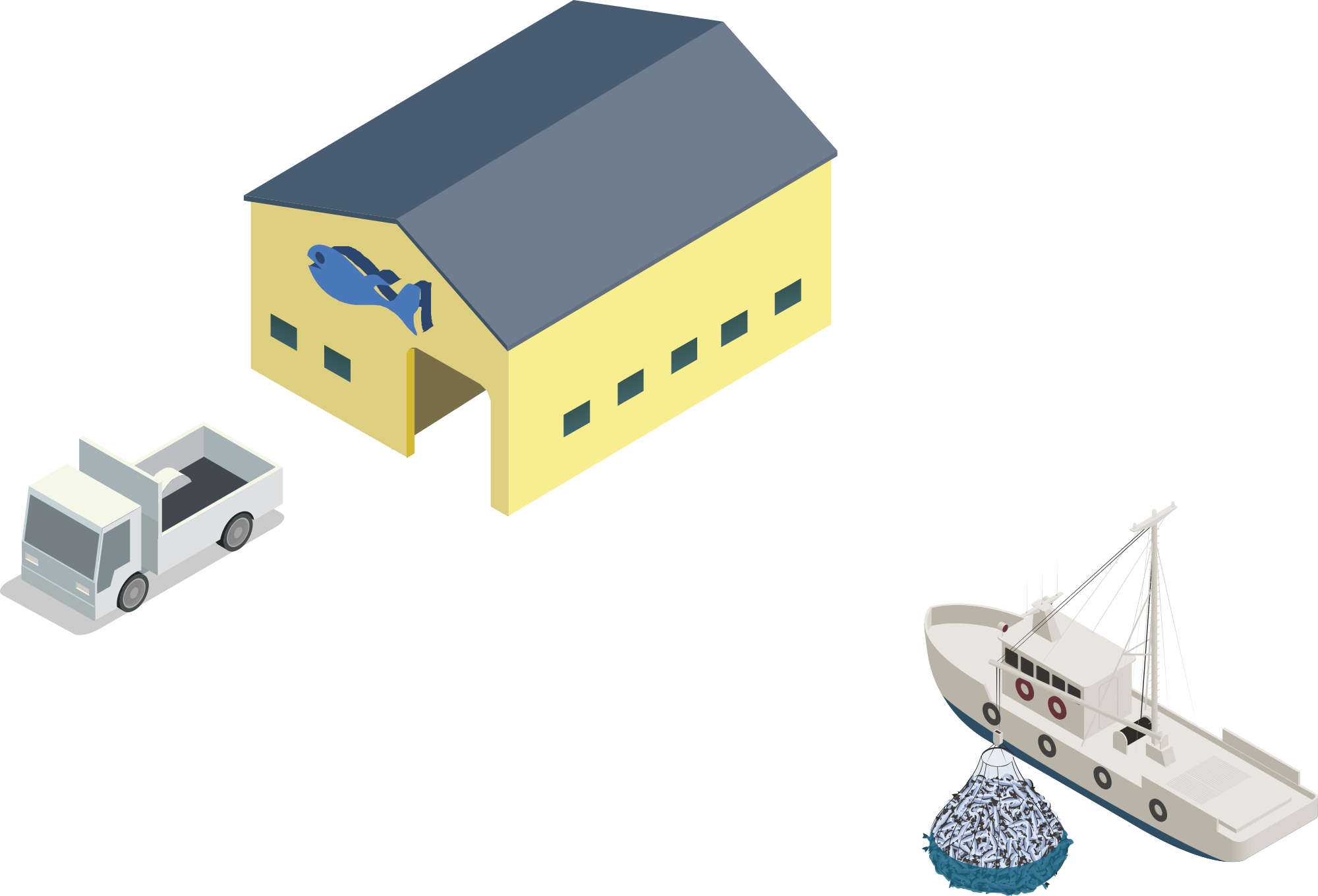 - remix+327129 fish fishing work ship shipyard dock ocean EPA isometric building truck boat net