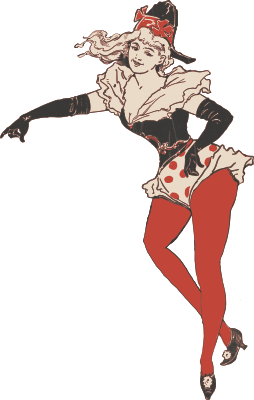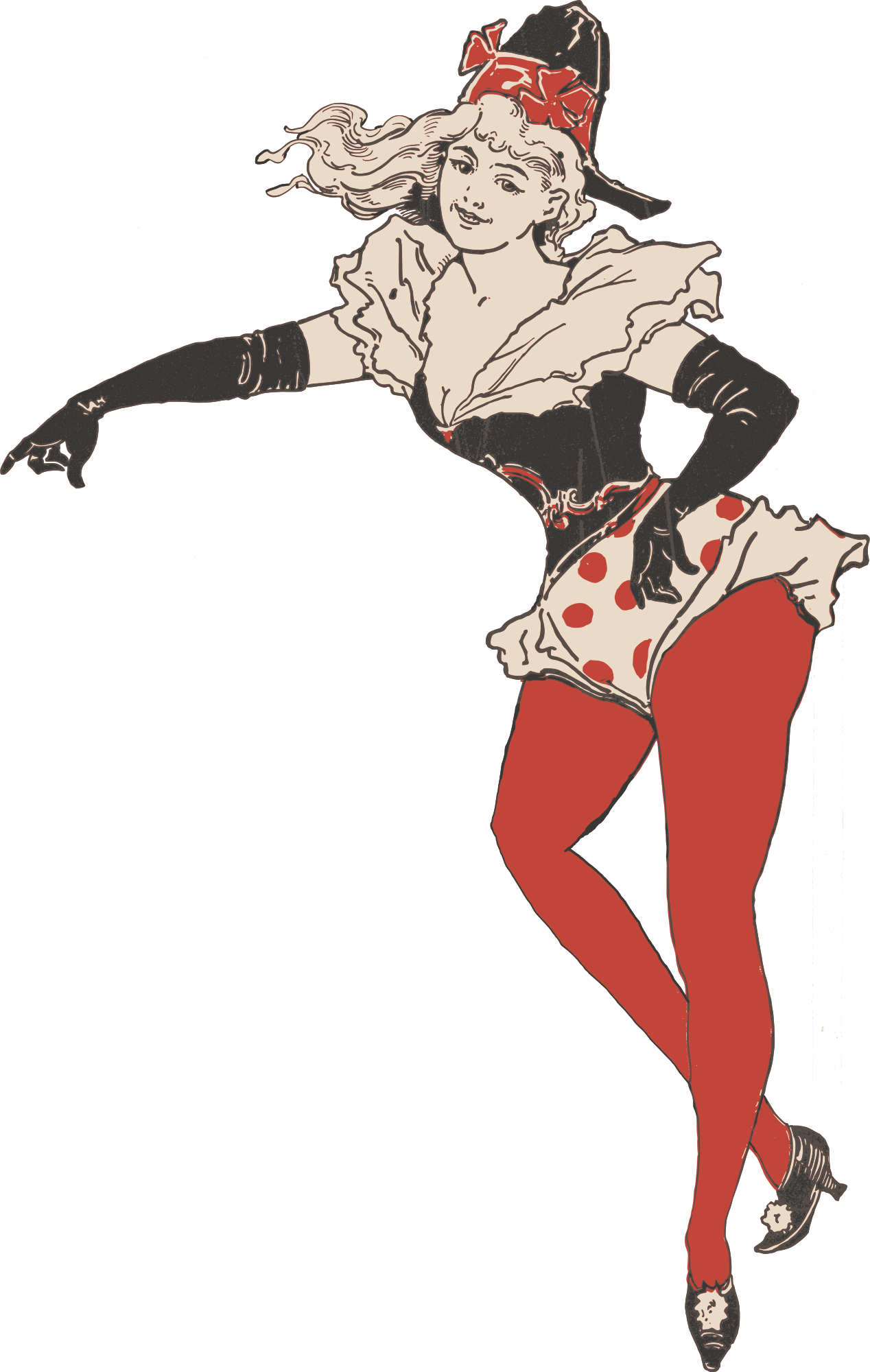 lady woman female red tights points indicate polkadots retro vintage 1896 smile happy hat gloves style fashion pointing