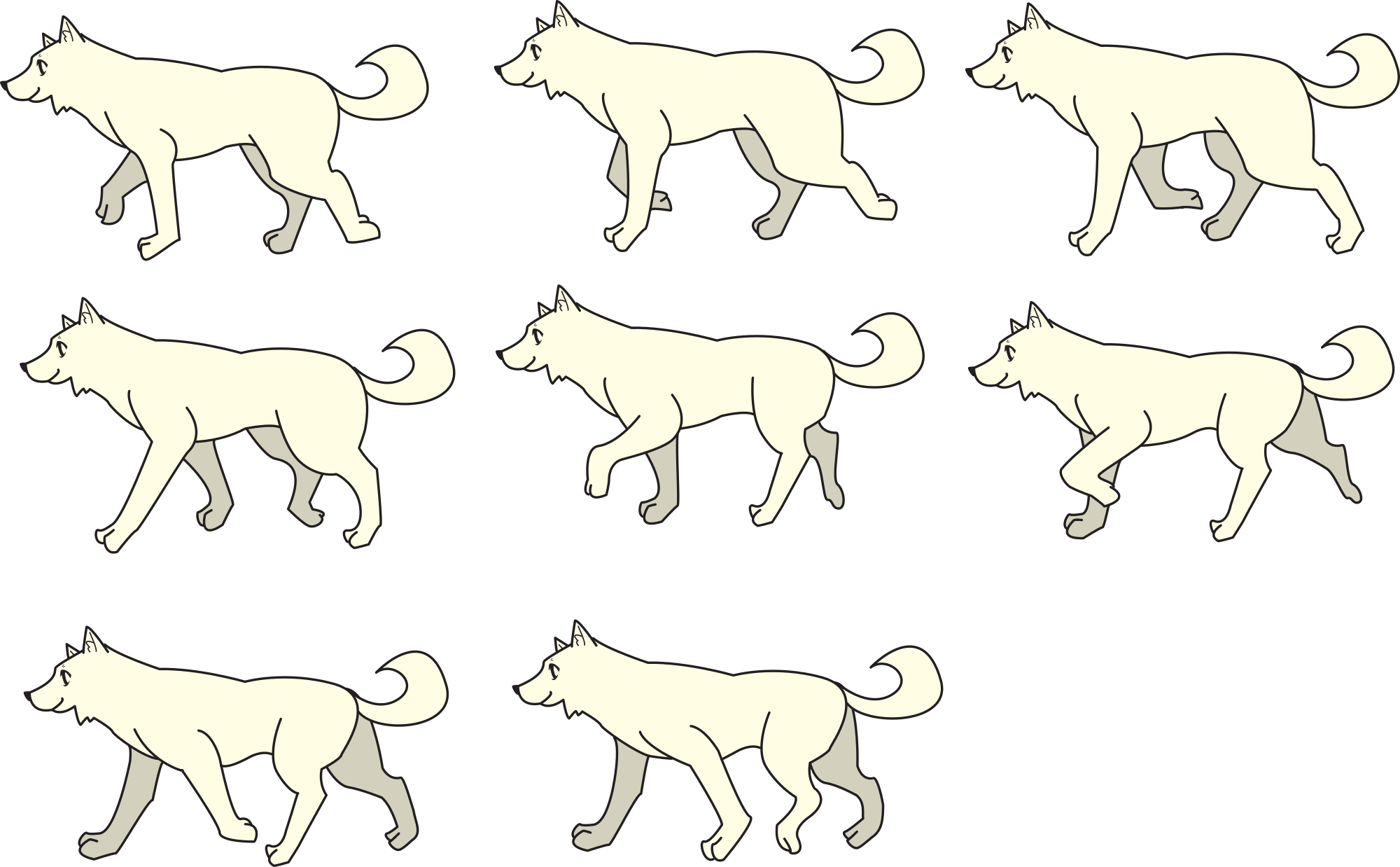 A collection of a Japanese breed Shiba Inu dog walking; can be combined to create a walking animation. From a public domain website here: https://publicdomainq.net/dog-animal-0047906/