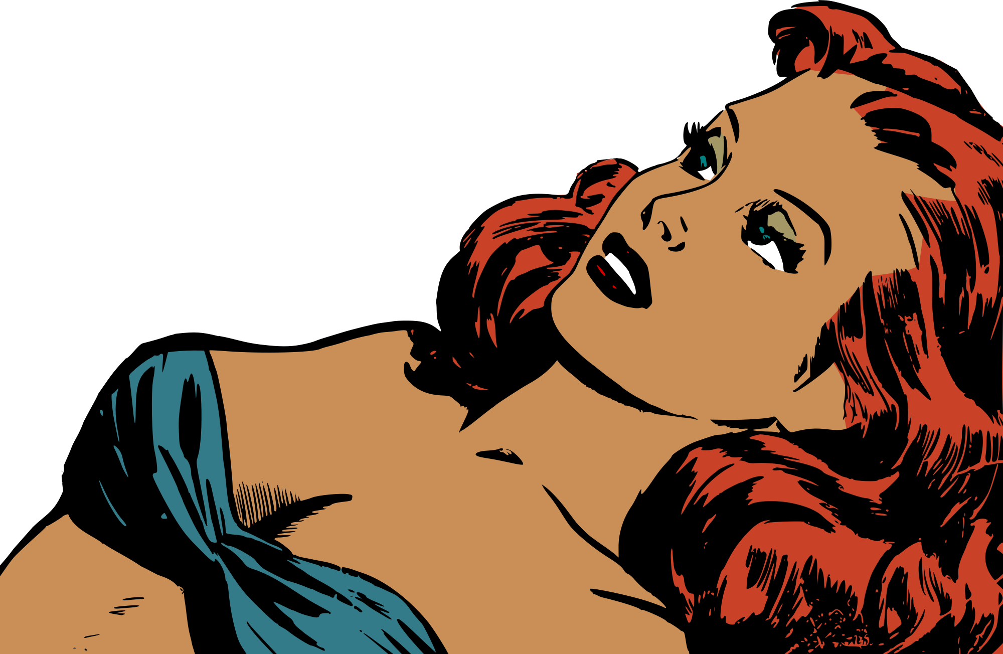 Redhead woman in blue bikini.