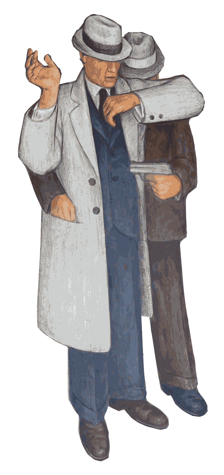 a mugger in a trench-coat behind a man in a trench-coat holds a gun on a guy to steal his wallet