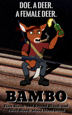 A poster of an anthropomorphized deer smoking a cigar with an enraged facial expression, wearing an ammunition bandolier and a scabbarded machete with a loaded RPG launcher slung over one shoulder, carrying an assault rifle in one hand and preparing to throw a lit Molotov cocktail with the other hand, below the words “Doe. A deer. A female deer.” and subtitled “Bambo—First Blood: and Second Blood: and Third Blood: blood blood blood”. Cinematic background version inspired by the poster for the 1935 Bollywood film Hunterwali (https://en.wikipedia.org/wiki/Hunterwali) featuring Fearless Nadia (https://en.wikipedia.org/wiki/Fearless_Nadia).
