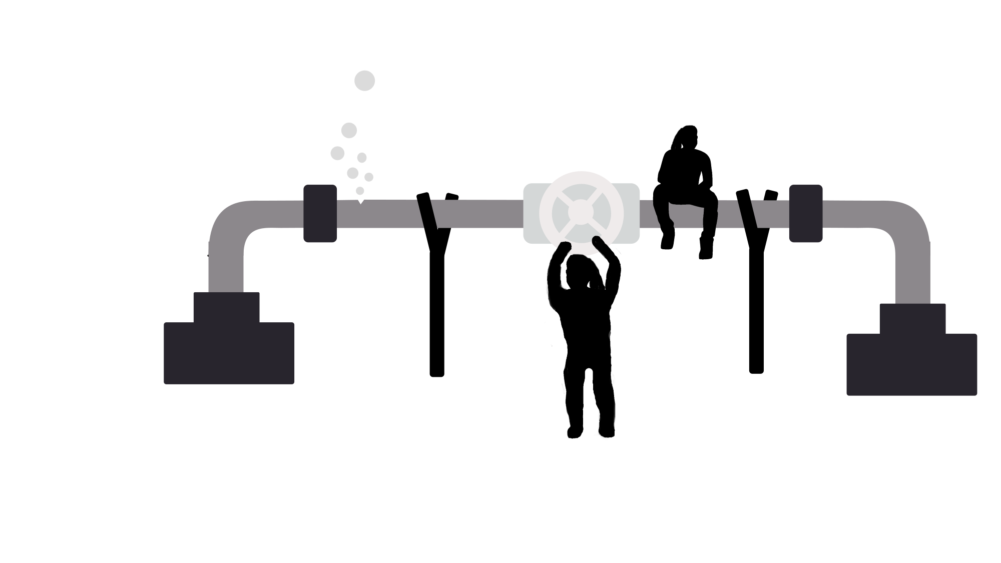 A pipeline that is operated by two humans, one turning a wheel on the ipline, another sitting on it. The pipeline is leaking gas.