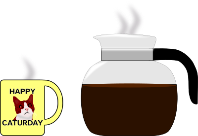 a carafe of hot coffee and a cup with a cat face which says "Happy Caturday"