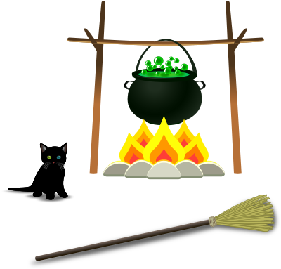 black cat, broom and a witch's cauldron
