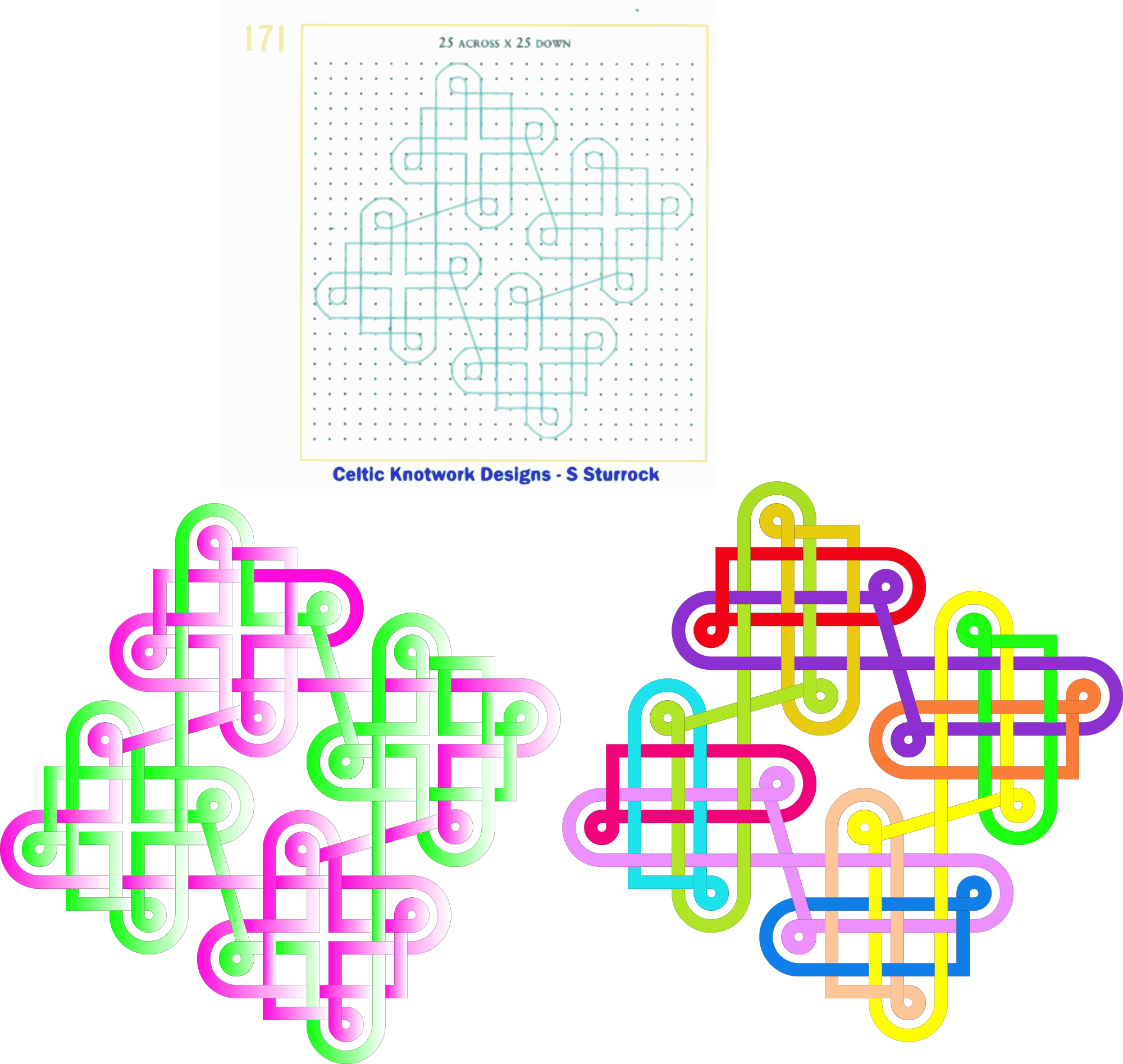 The 7th Century Book Of Durrow has a number of Celtic Knot designs’. It is now at Trinity College Dublin and their site has high resolution images of the entire book. This example shows how Sturrock draws one of the motifs. Two coloured knots based on Sturrock are shown. The bottom left has the suggested arrangement at the centre of the four ‘elements’ and gives two paths. The bottom right has an altered centre arrangement and results in 16 paths.