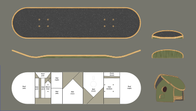 A skateboard layout showing a template of the deck with cut marks where you can cut the plywood into pieces which then can be assembled into a birdhouse.