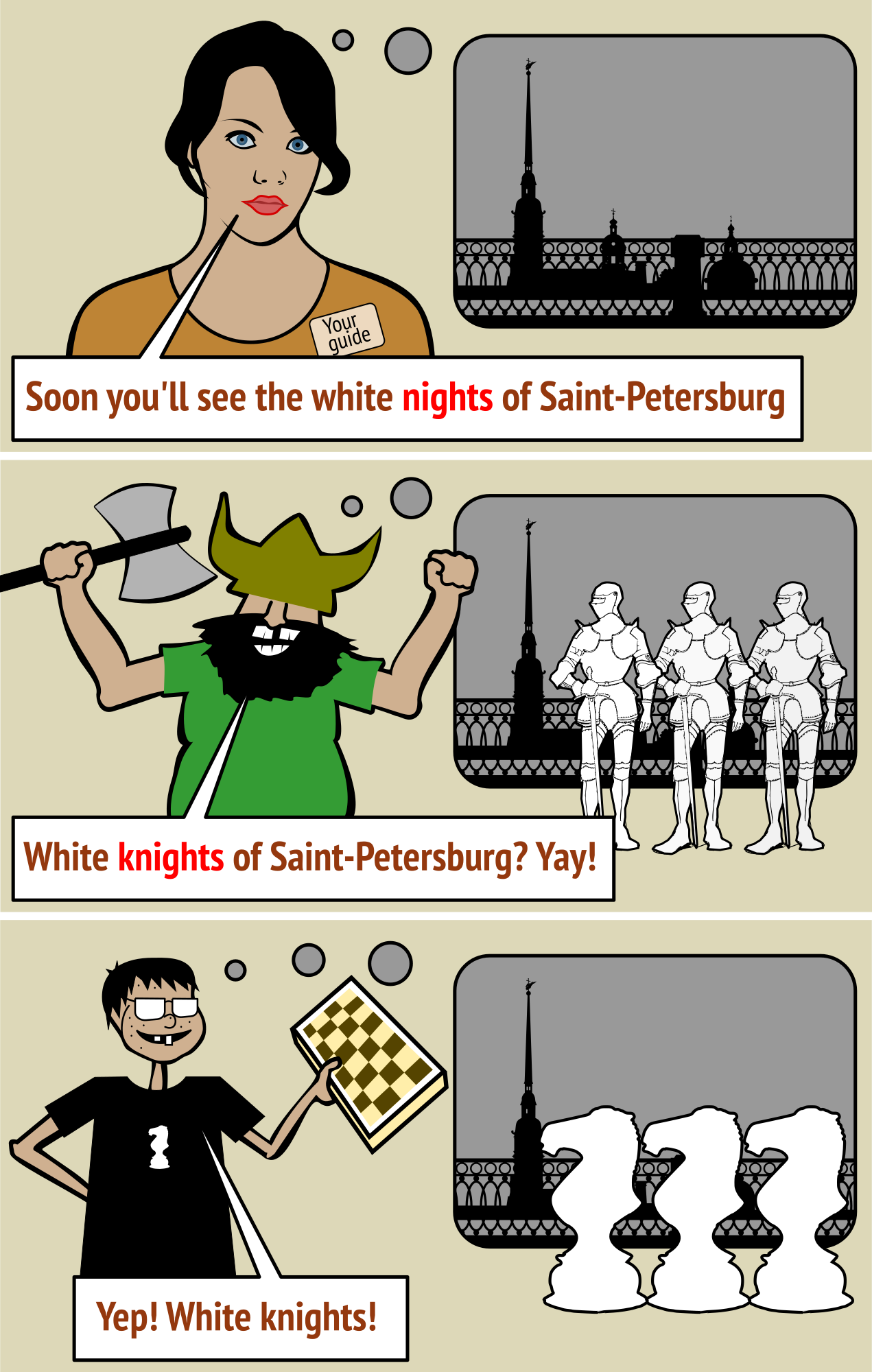 The phrase "White Nights" sounds like "White Knights". And the "White Knights" can be chess pieces too.