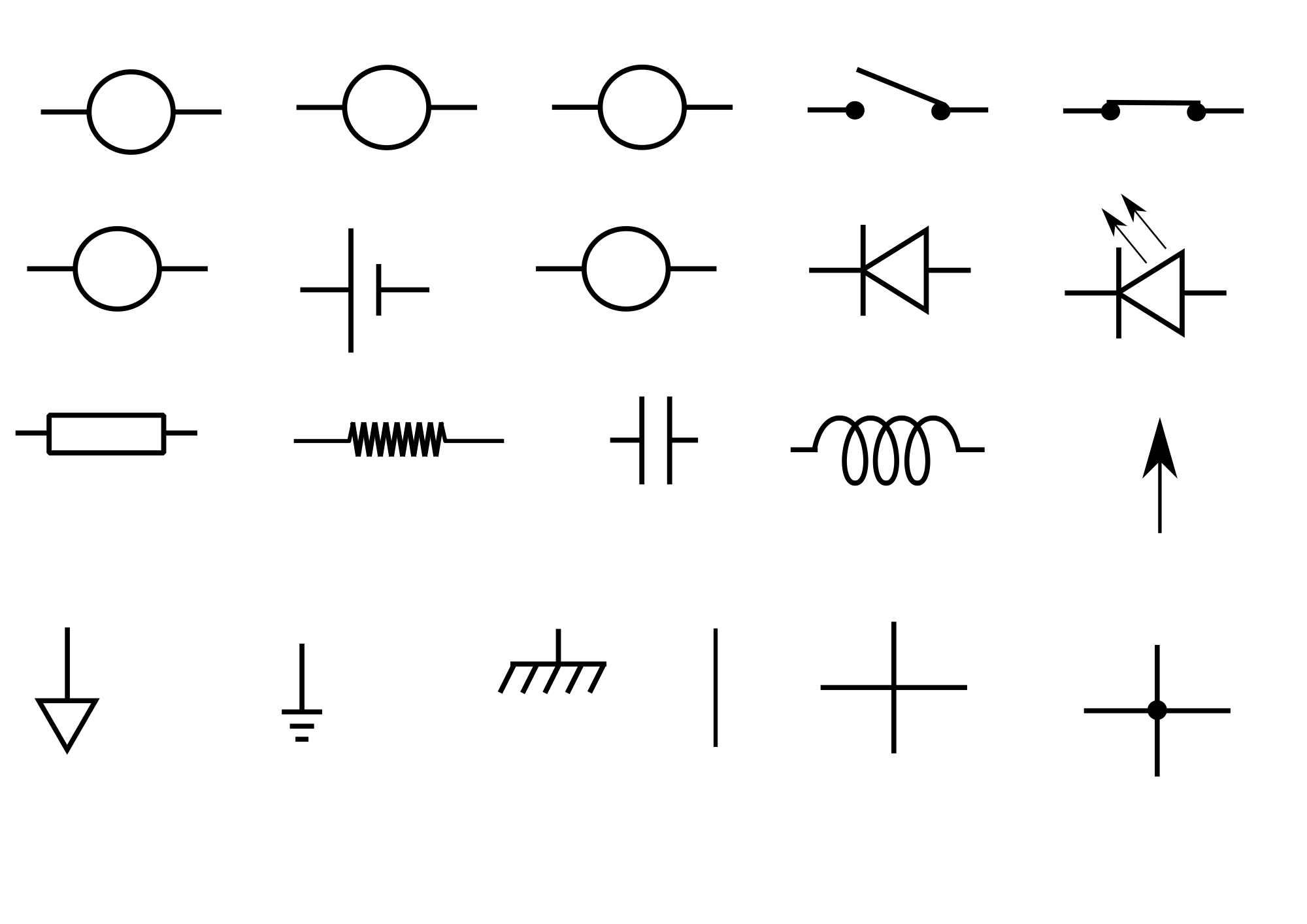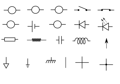 Edited from the work of @abbetik (https://openclipart.org/detail/191395/electricitycomponant) to use english names, removed a few things that I didn't need for my application and added a few things that I did.