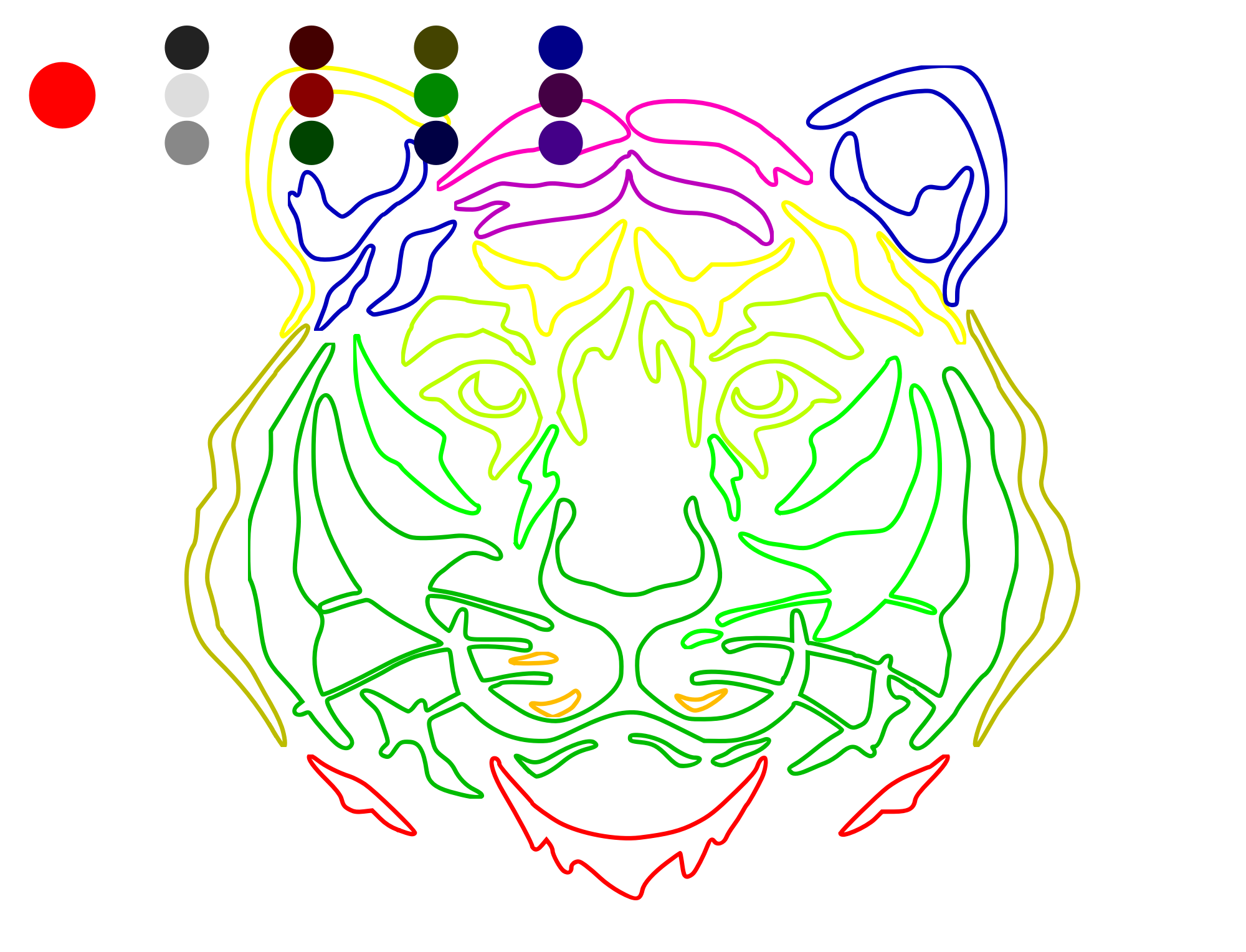 ...since tigers are entangled - like everything else - the colors just go into another tiger. click the circles for style options, red to hide. (this could also have gone marxist: redistribute the color to the tiger proletariat! :-)