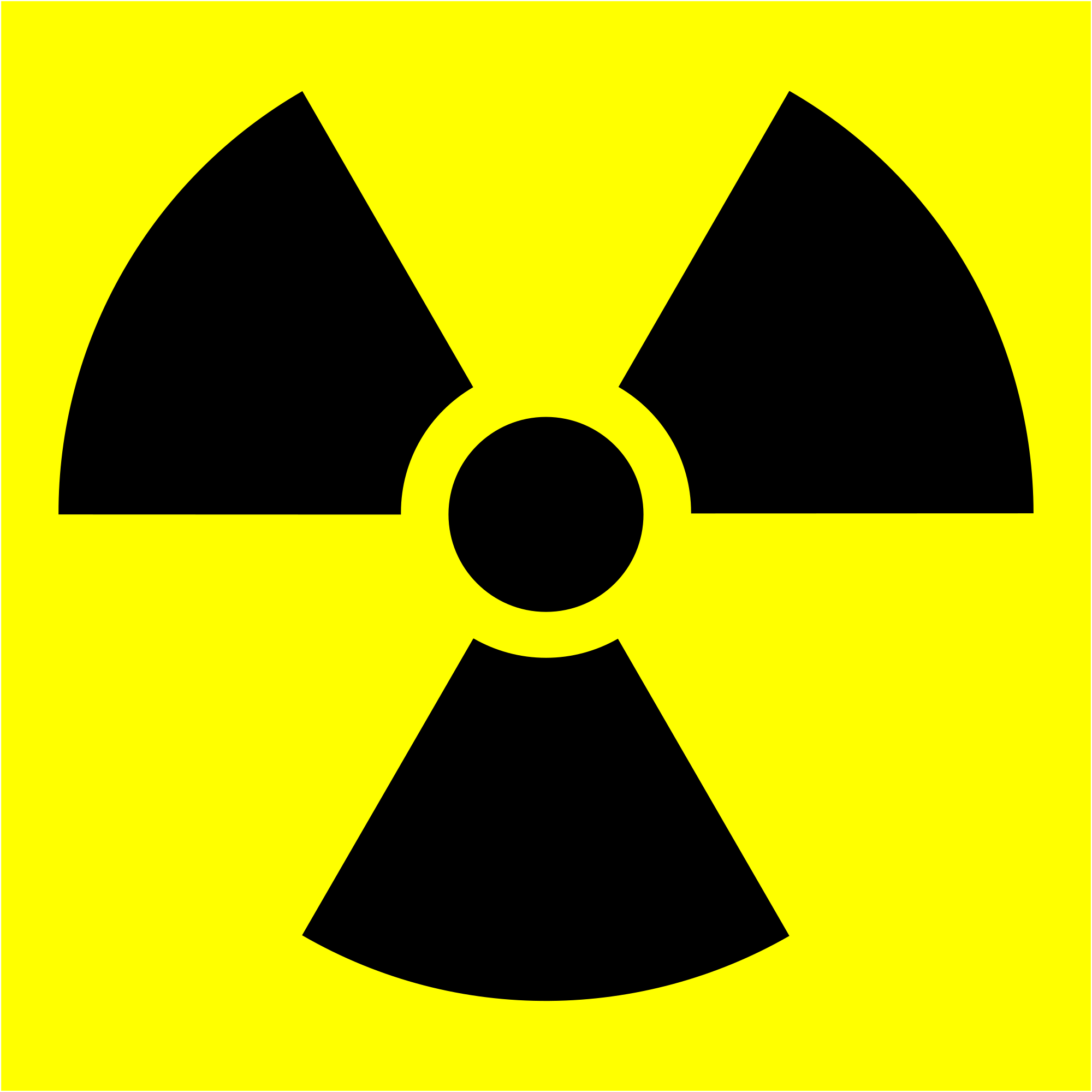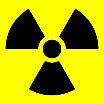 The symbol for radioactive hazard, following the official proportion specifications (radius R for center circle, 1.5R to 5R for blades of trefoil). Done in Inkscape.