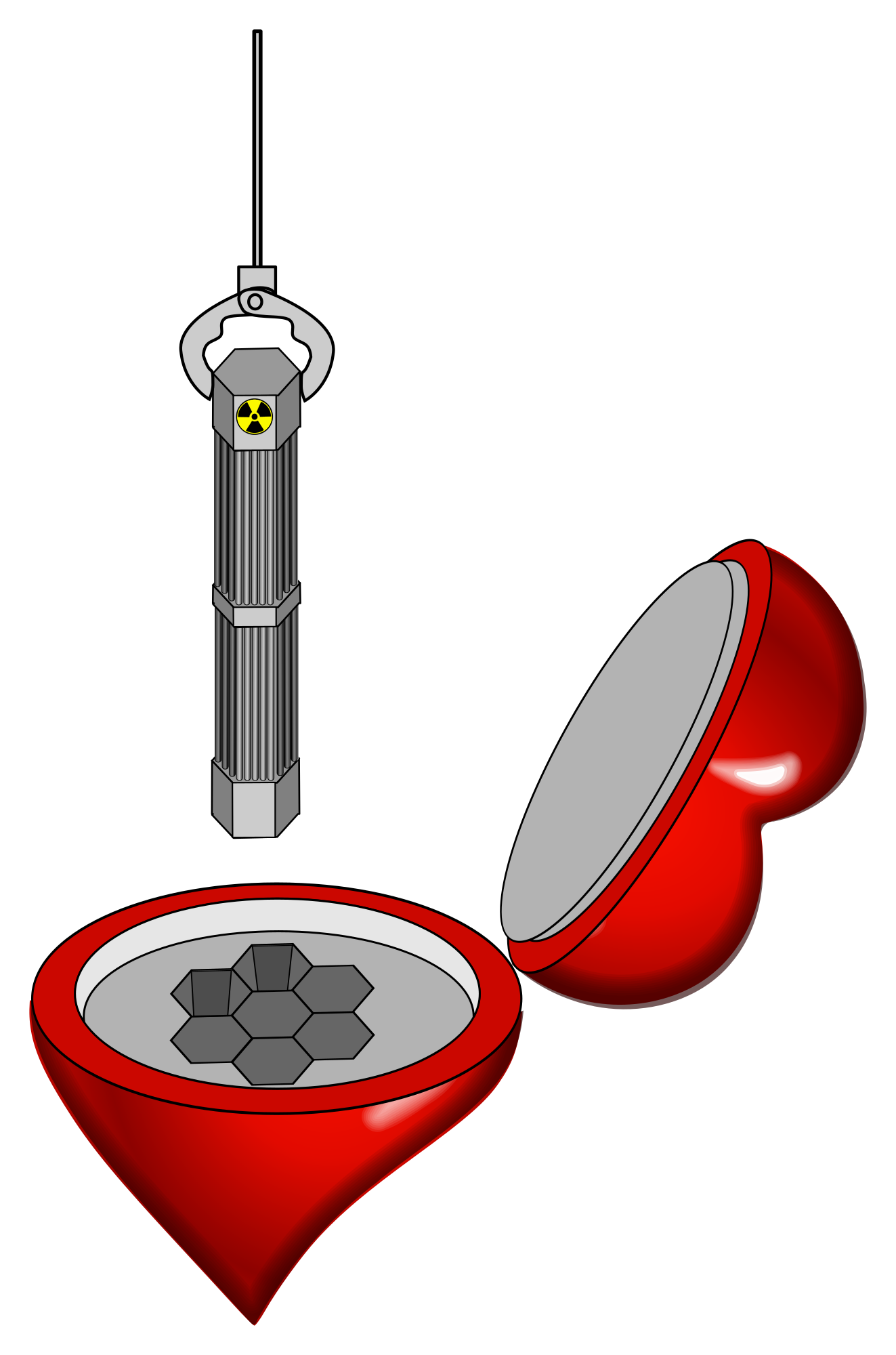 A crane lowering a nuclear fuel assembly into a heart shaped reactor.