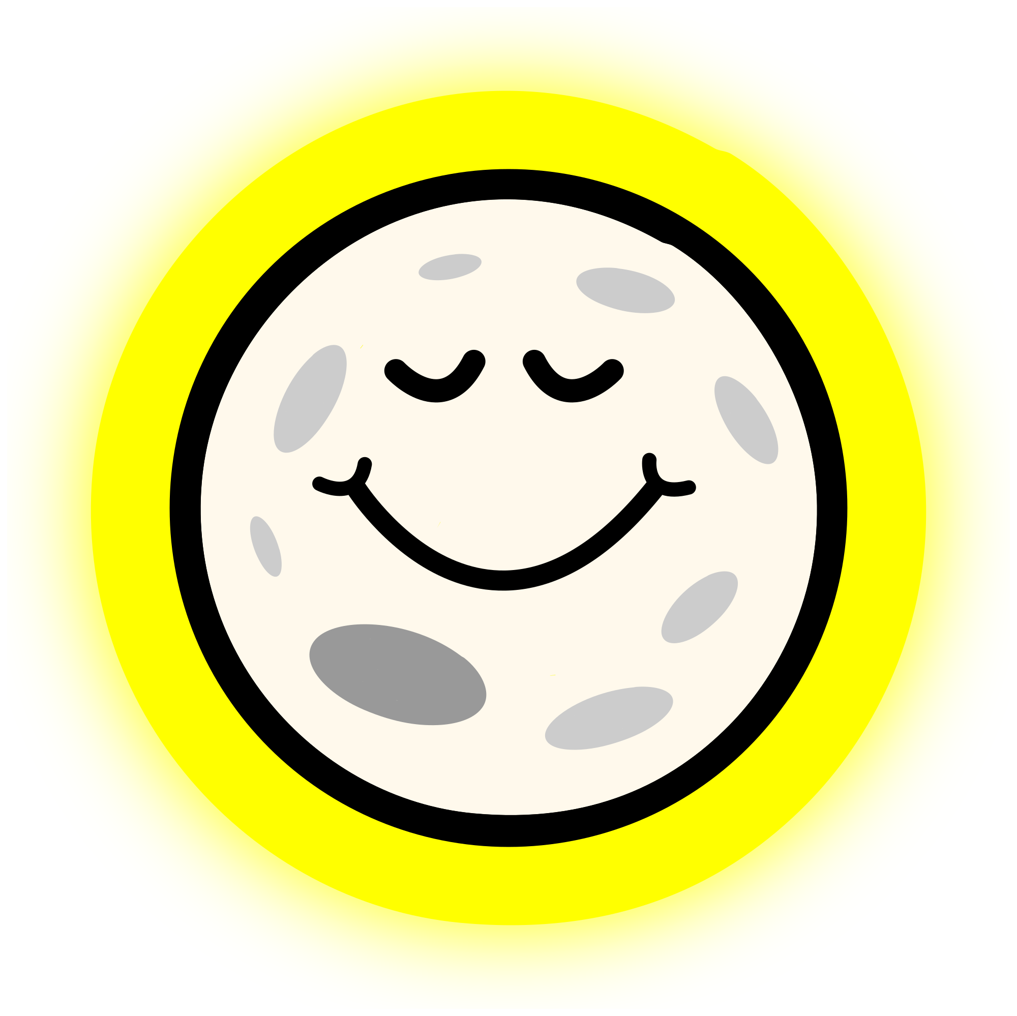A cartoon moon with a happy face, surrounded by a bright yellow glowing halo. The glow is in a separate layer in the SVG file so it can be switched off easily if you just want the moon.