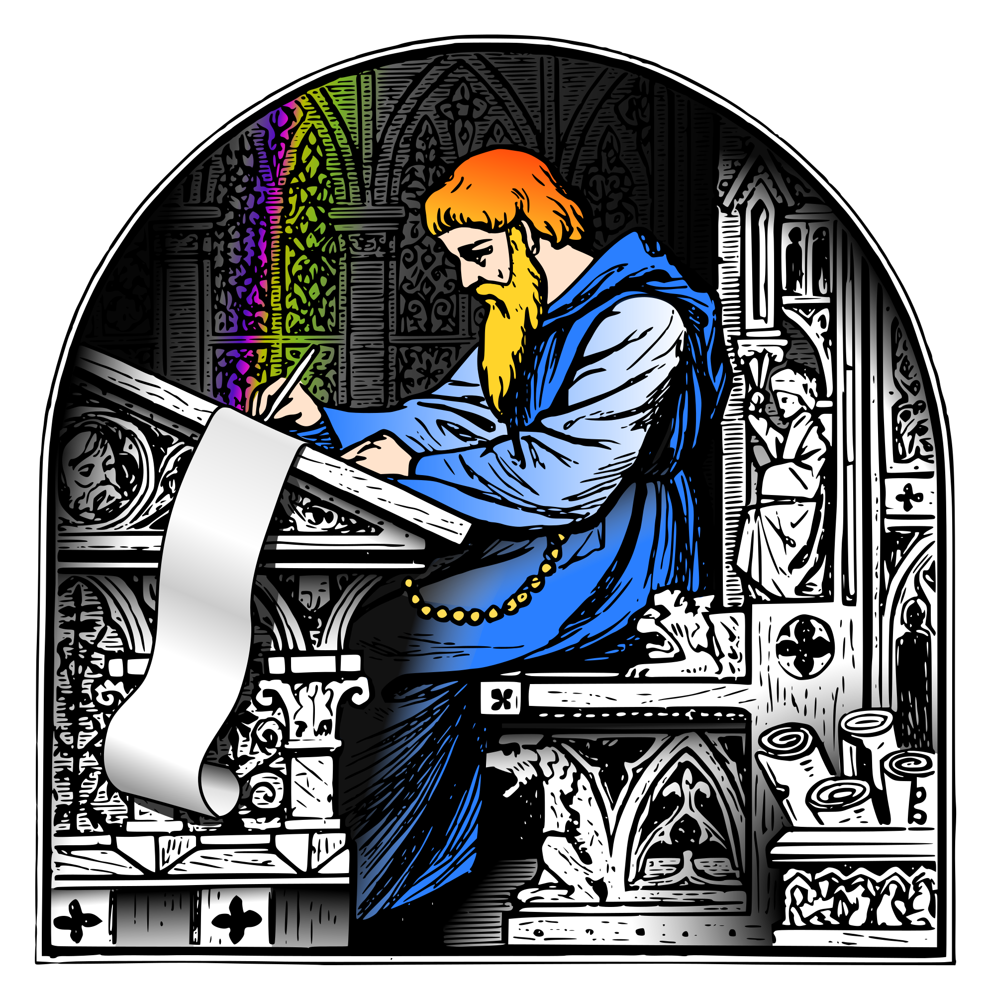 I added colors and modified a little bit (cf the scroll) this clipart which dates from the prehistory... of openclipart.org. Liftarn uploaded it in 2006.