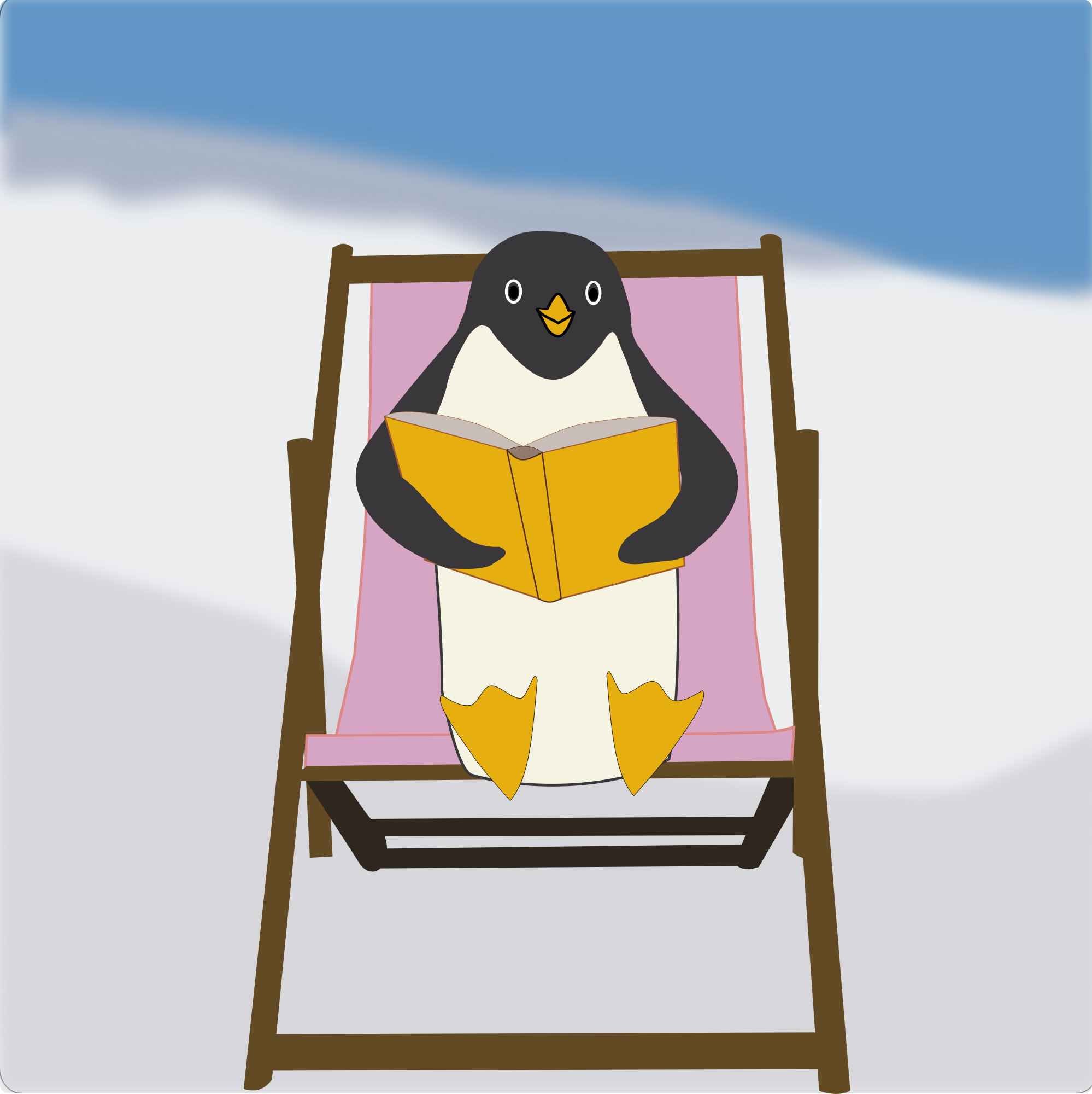 Penguin sitting on a deckchair and reading a yellow book.