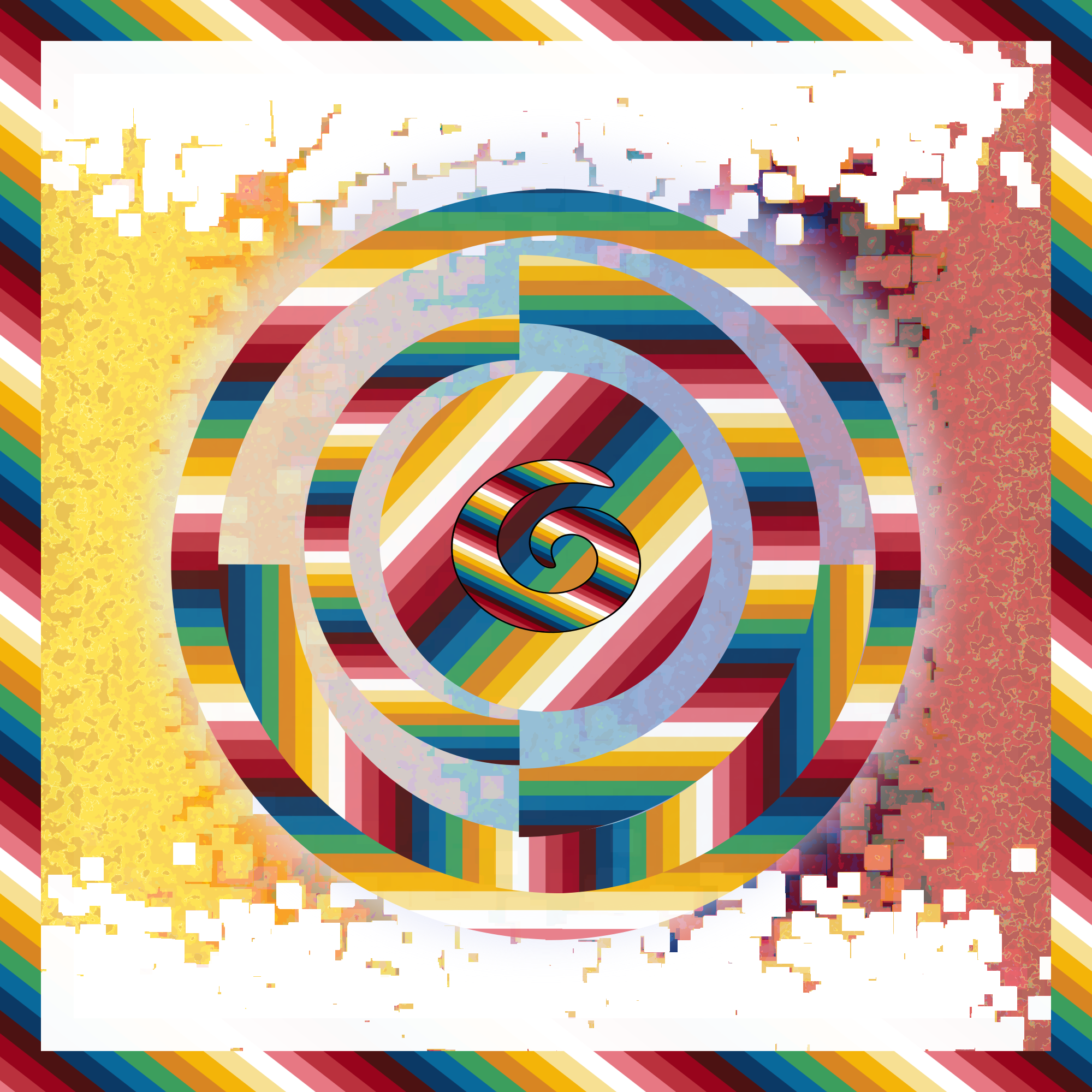 A design inspired by the work of the French painter Delaunay with circles and squares. Almost each part of the drawing has the same pattern a background and borders except the black shape behind the spiral and the pale circle between the square and the other shapes.