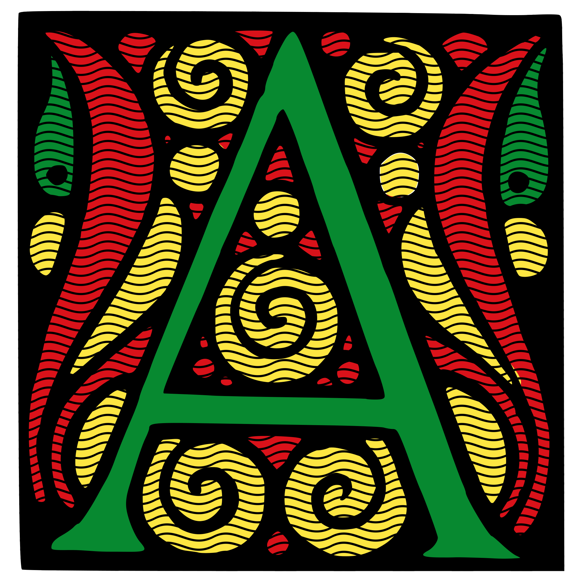 Colored-in version of an ornamental initial capital 'A' from a 1922 edition of Martin Buber's Die Legende des Baal-schem published by Literarische Anstalt, Rütten und Loening in Frankfurt. Uses the pan-African colors: