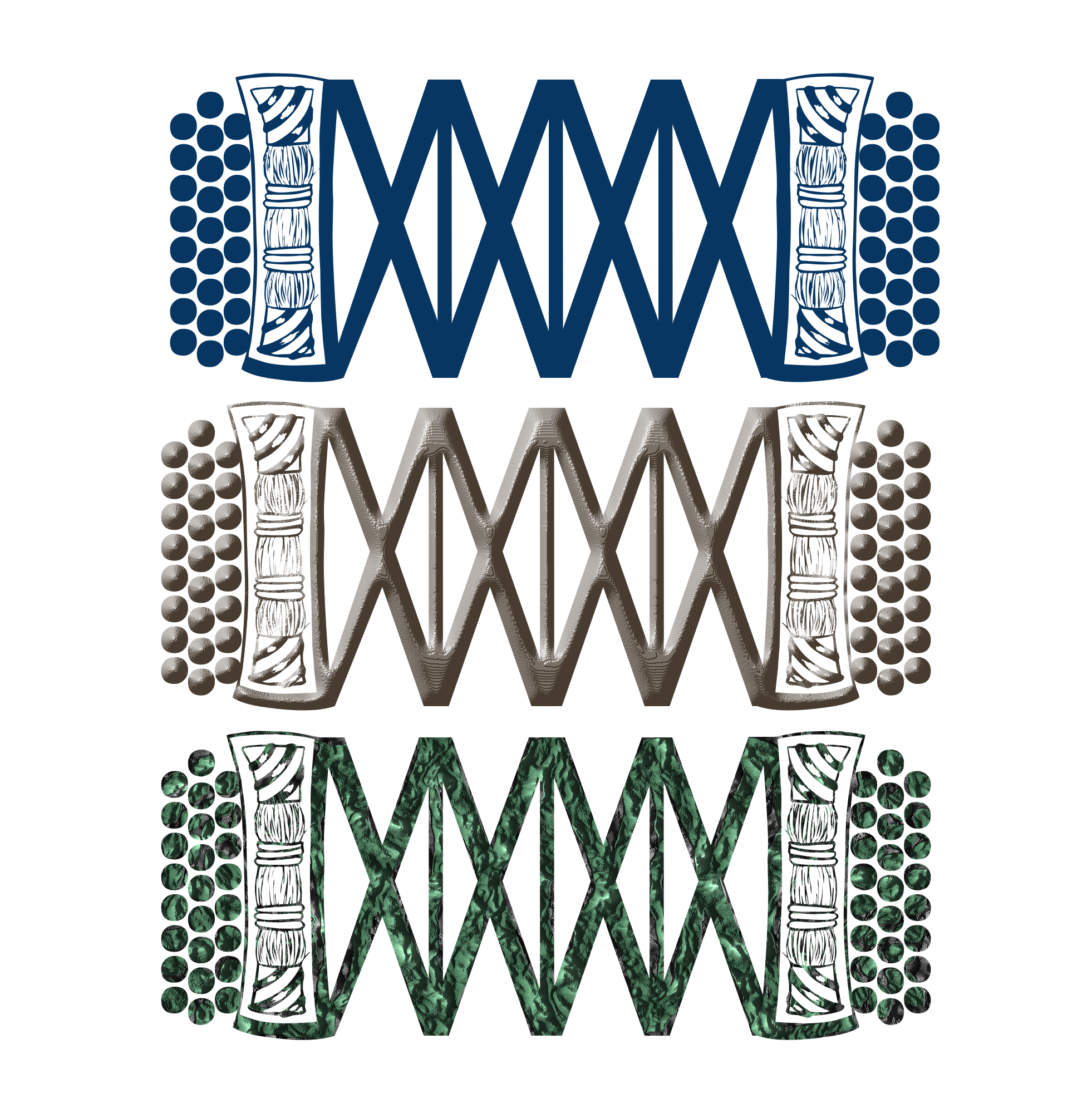 An accordion made for the challenge of March 2023 on the forum of Inkscape. It uses only letters and filters and nothing else. The first is "flat", the second uses the filter Relief Print and the third Rough Canvas.