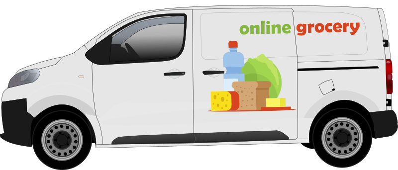 Delivery truck with a label containing basic food items and fictional company "online grocery" name