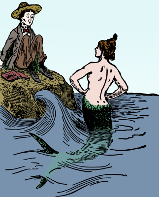 - mermaid shore man book cliff surprise ocean sea topless fantasy vintage retro waves hand on hip