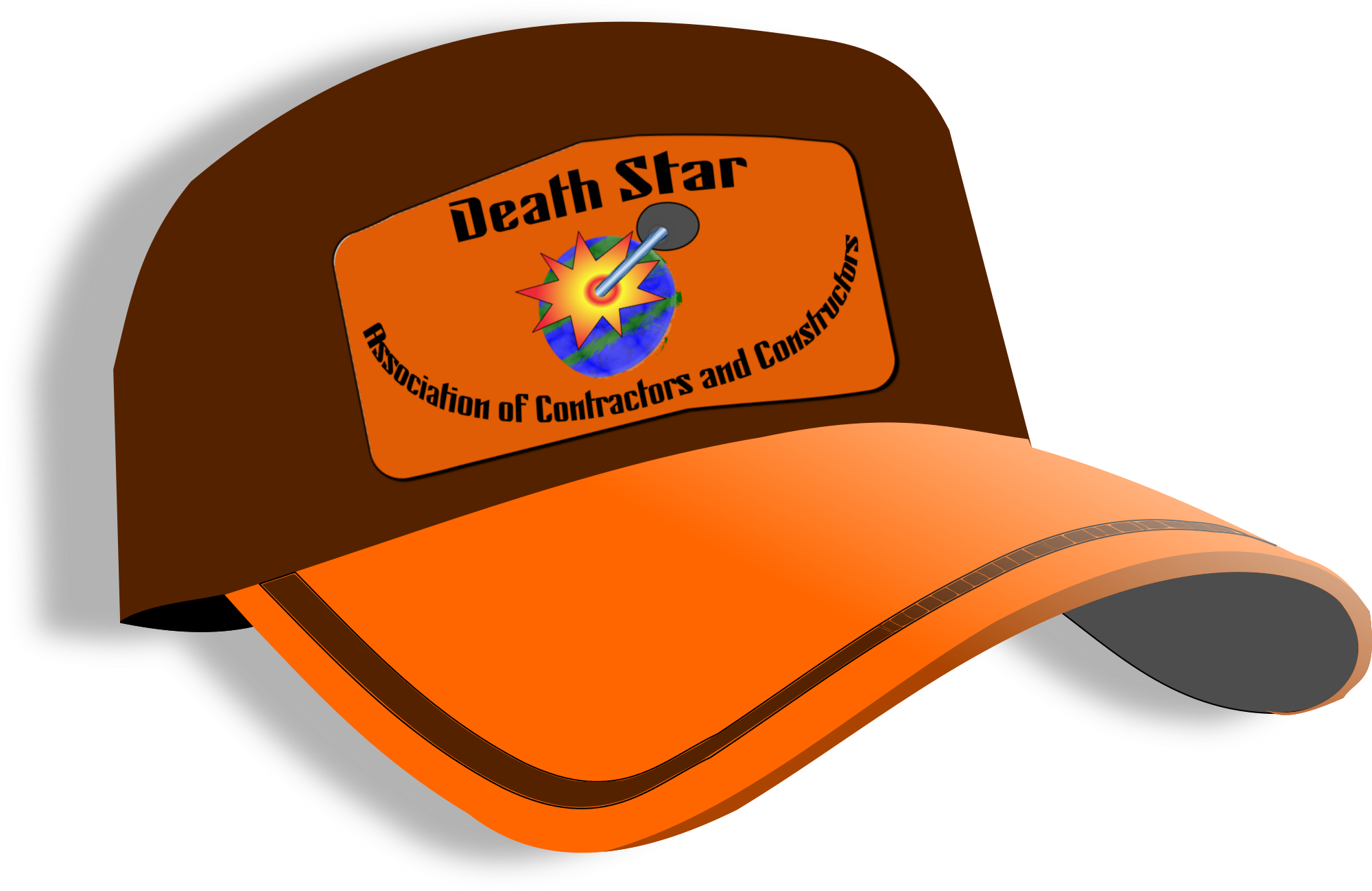 The fatal moral flaw of the Rebel plan is always that, when they blow up a Death Star or other evil super-weapon, there are not only combatants aboard but janitors and other maintenance personnel. In the case of the incomplete DS-2 Orbital Battle Station above the forest moon of Endor in the film Return of the Jedi, an enormous number of construction contractors would have been aboard and perished in the final explosion. This, then, is a cap featuring the patch of the (non-canonical) Death Star Association of Contractors and Constructors, perhaps fallen to the floor of the forest moon after the death of its hapless owner.