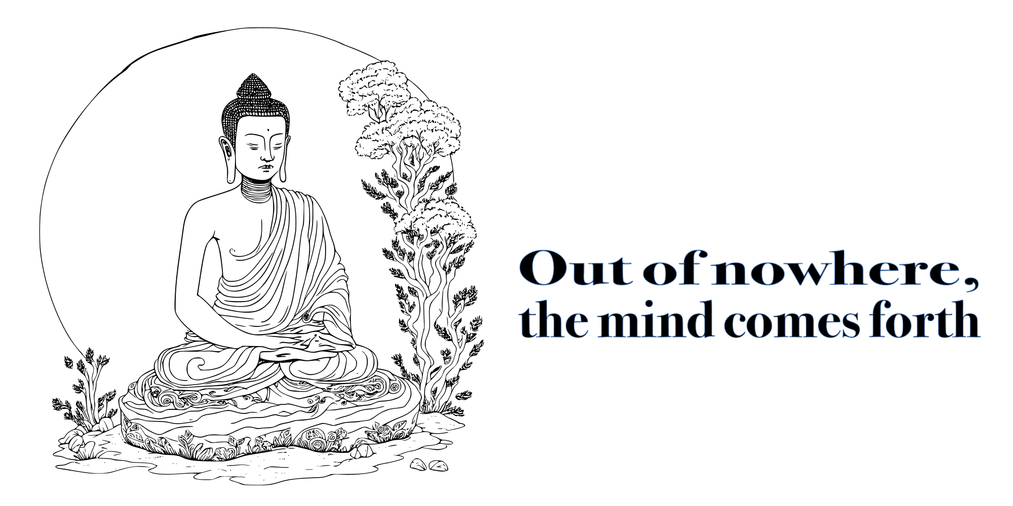a symbolic Buddha meditating with the famous zen koan quote "Out of nowhere, the mind comes forth"
