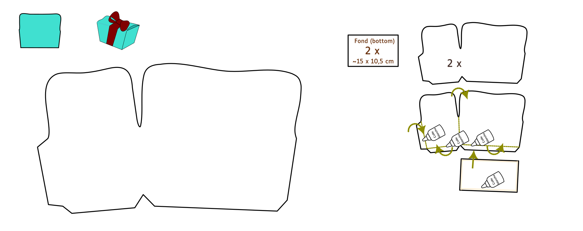 Patron de ballotin, explications intégrées. Dimensions fermé : environ 15 x 10,5 cm sur 8 cm de haut.