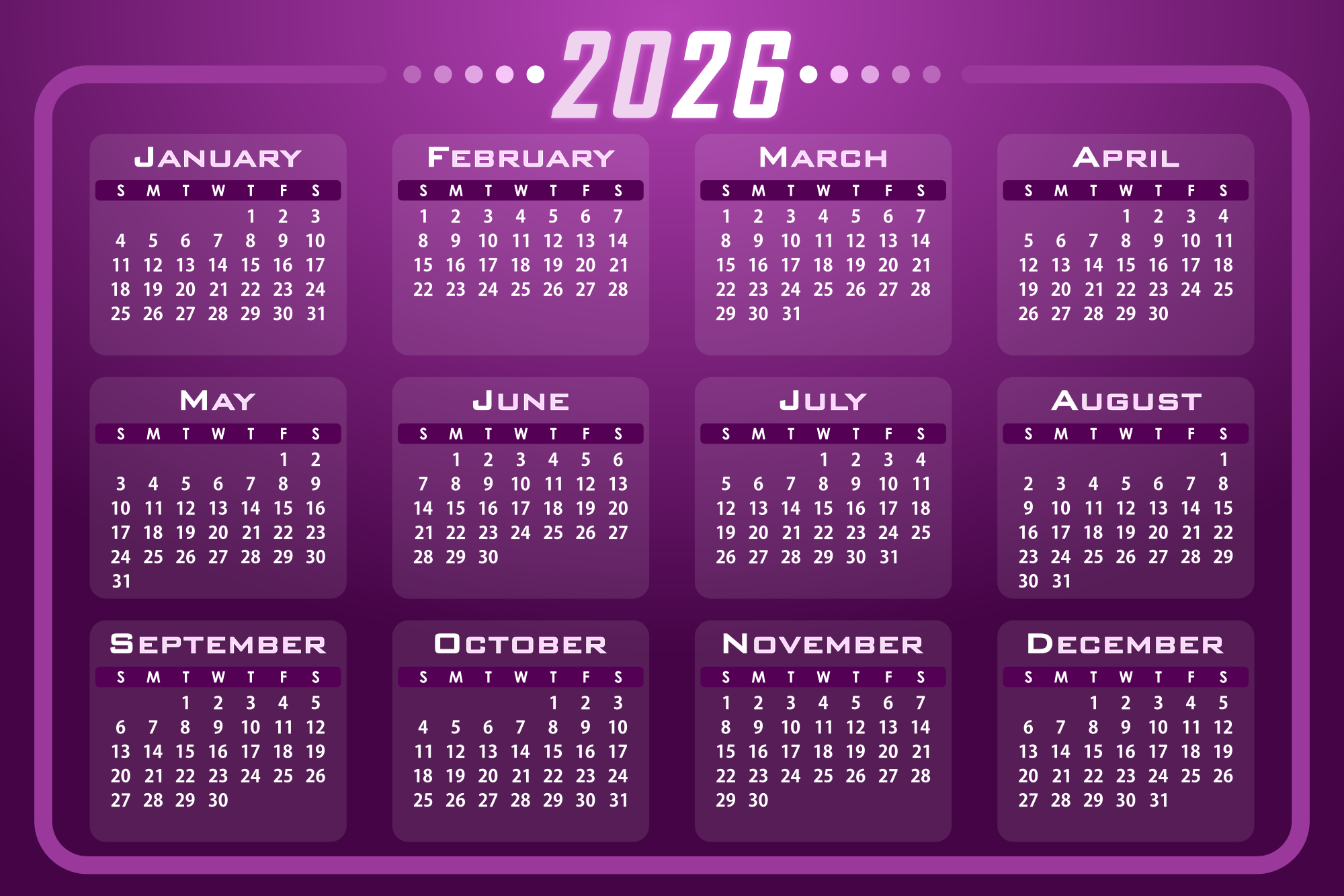 A calendar design for the year 2026.
