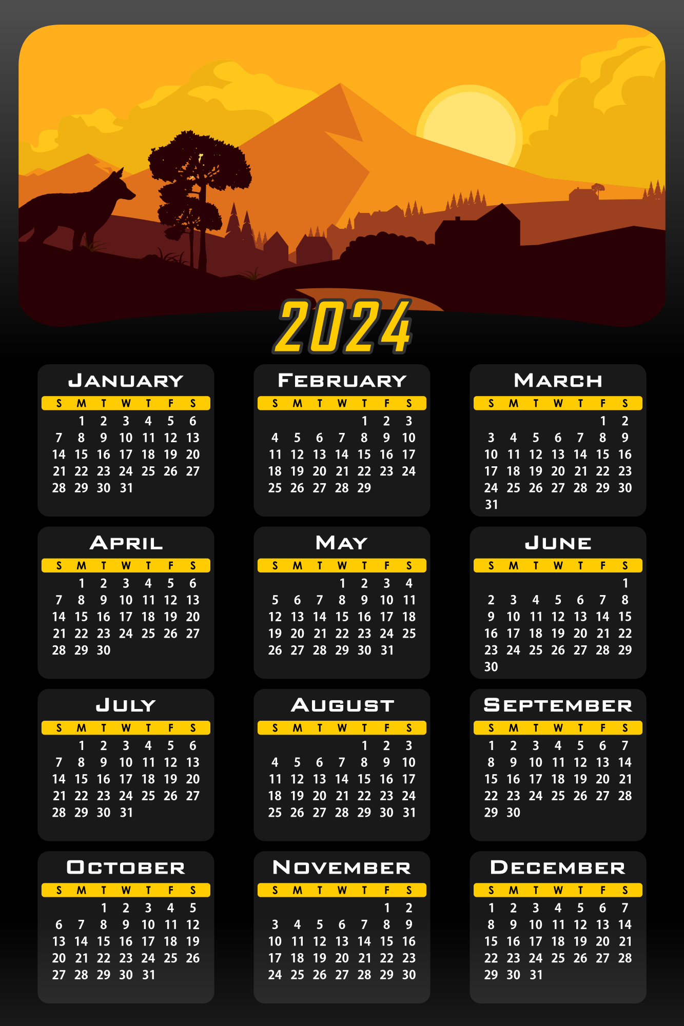 Calendar design for the year 2024 in portrait format with beautiful natural landscape.