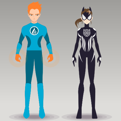 Illustration of a boy and a girl characters in anime style in superhero costume. The male design is inspired by this original character: https://openclipart.org/detail/27954/super-hero-flame