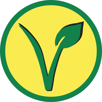 Vegan v in green in yellow circle with green border