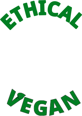 Ethical vegan text in green and curved info circle shape, transparent background