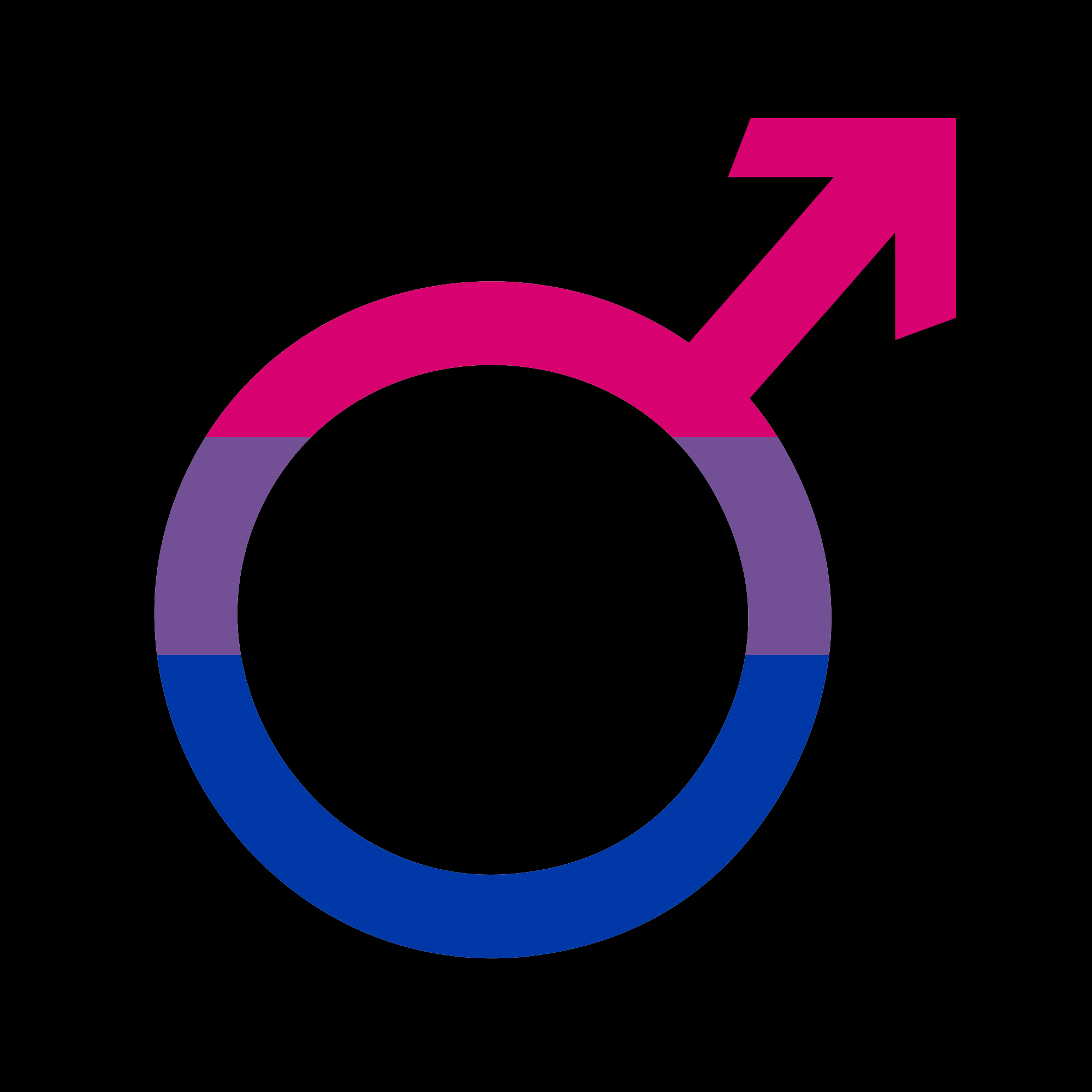 Bisexual pride flag colors in the mars symbol shape in a black background representing male bisexuality in a safe-for-work form