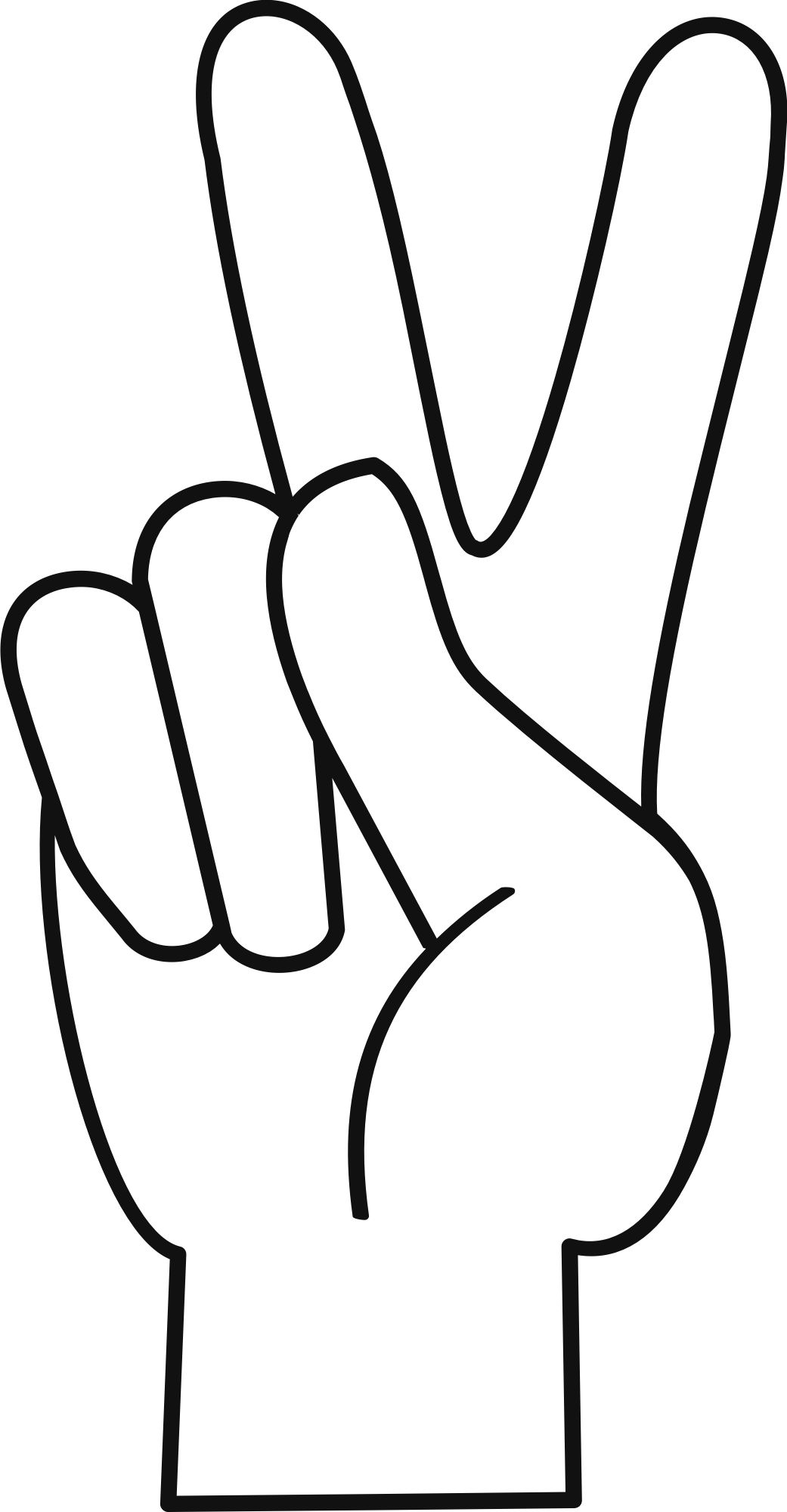 Peace symbol V sign outline with transparency - this is a single path version of the original, which means it can be put over an existing background without showing up as white. Smoothing improvements have been made for top of two fingers, thumb nail and the curve at the side of the thumb, plus the thumb's border (gap) thickness is now the same as the others.